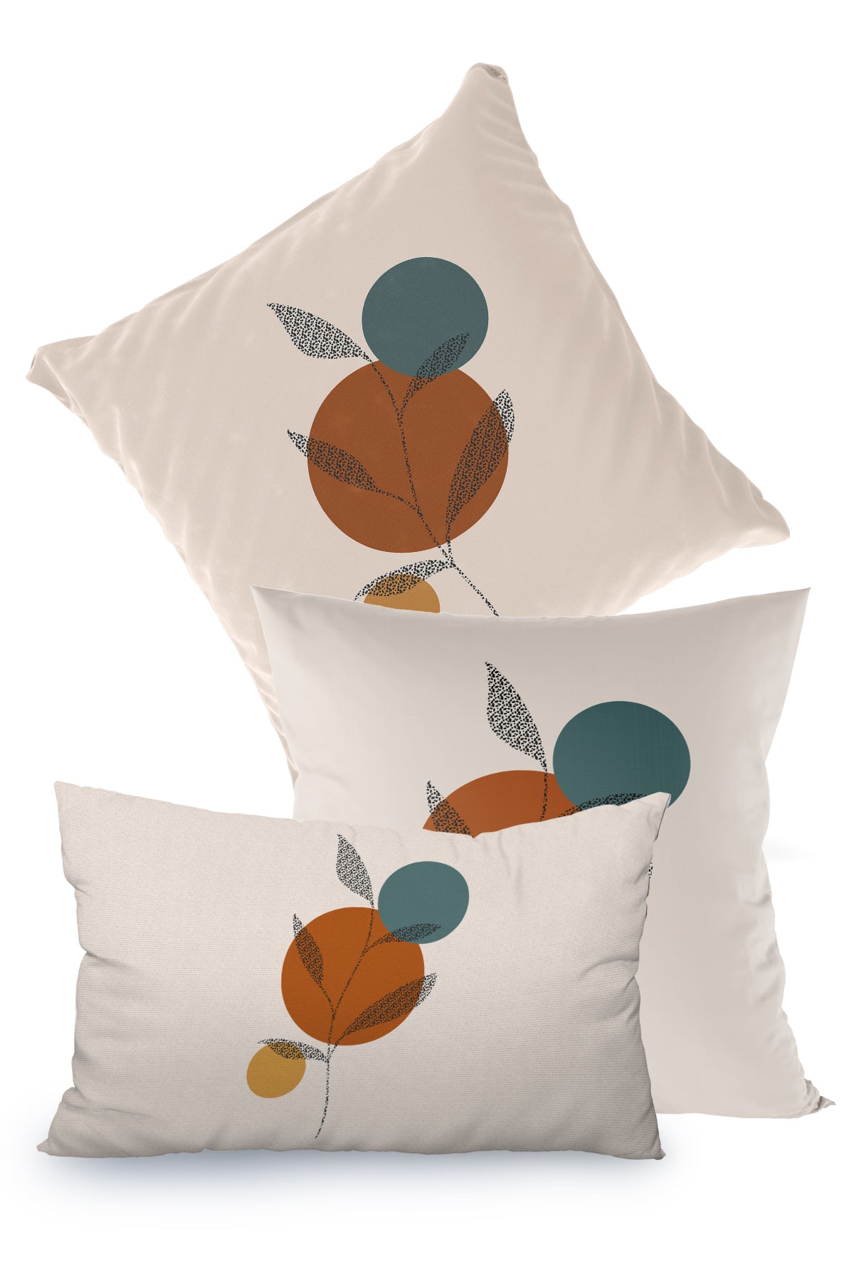 Krem rengi bir zemin üzerinde, minimalist ve soyut bir desene sahip olan bu kırlent kılıfı, modern ve sanatsal bir estetik sunar. Desenin merkezinde turuncu-kahve, hardal sarısı ve yeşilimsi mavi tonlarda üç farklı büyüklükte daire bulunur. Bu dairelerin üzerine, ince benekli çizgilerle çizilmiş zarif bir dal ve yaprak motifi yerleştirilmiştir. Bu sade, doğal ve geometrik tasarım, mekana dinginlik, doğallık ve sanatsal bir hava katmak için idealdir.