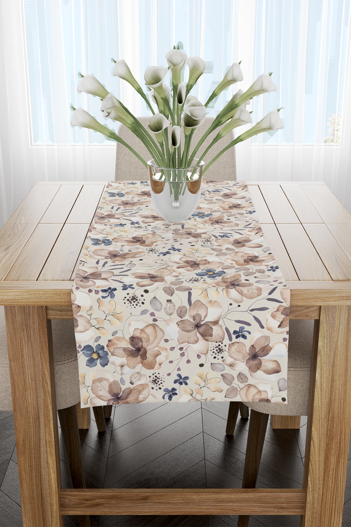 Yumuşak krem rengi bir zemin üzerinde, zarif ve dingin bir çiçek deseni sunan bu runner (masa örtüsü), masanıza sulu boya esintili sofistike bir görünüm katar. Kahverengi, bej, soluk mor ve hafif mavi tonlardaki şeffaf çiçek ve yaprak motifleri, tasarıma narin ve huzurlu bir hava verir. Desen, yemek masası, sehpa veya konsolunuzun dekorasyonuna doğal, klasik ve sakin bir şıklık katmak için mükemmeldir. Vintage, country veya sade modern dekorasyonlarla kolayca uyum sağlar.