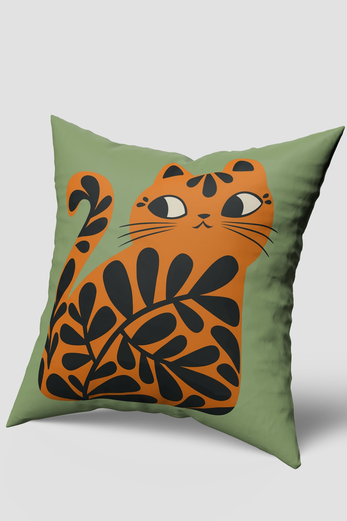 Yeşil (haki) zemin üzerinde, turuncu ve siyah renklerle stilize edilmiş sevimli bir kedi figürünü taşıyan bu kırlent kılıfı, modern ve doğal bir estetik sunar. Kedinin vücudu ve kuyruğu, kürk yerine geçen organik siyah yaprak motifleriyle bezenmiştir. Büyük gözleri ve minimalist çizimi, karaktere eğlenceli ve sanatsal bir hava katıyor. Özellikle doğa, bitki ve hayvan temalarını sevenler için ideal olan bu kılıf, mekana sıcaklık ve özgün bir karakter getirecektir.
