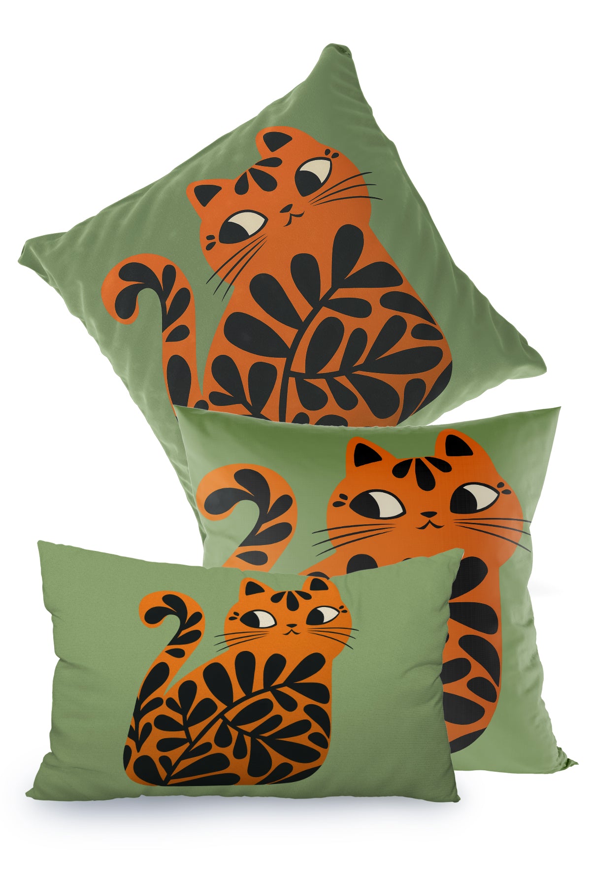 Yeşil Turuncu Sevimli Kedi Desenli Kırlent Kılıfı
