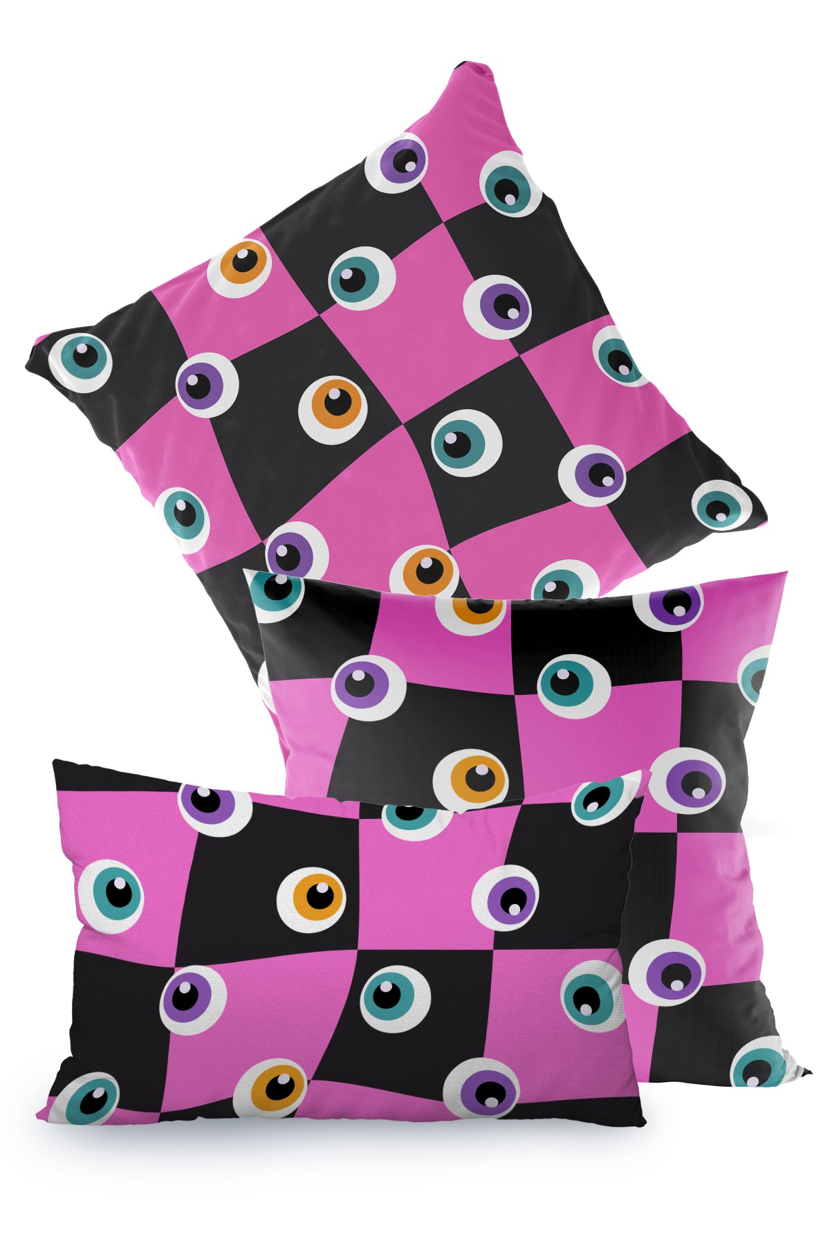 Bu kırlent kılıfı, pembe ve siyahın zıtlığı üzerine yerleştirilmiş, farklı renklerdeki büyük göz motifleriyle dikkat çekiyor. Klasik dama tahtası deseninin içinde her kareye yerleşen mavi, sarı ve mor irisli gözler, tasarıma eğlenceli, ürkütücü ve pop art esintili bir hava katıyor. Odasına cesur, espirili ve sıra dışı bir dokunuş eklemek isteyenler için ideal olan bu kılıf, dekorasyonunuzun odak noktası olmaya adaydır. Özellikle genç odaları ve temalı partiler için harika bir tercihtir.