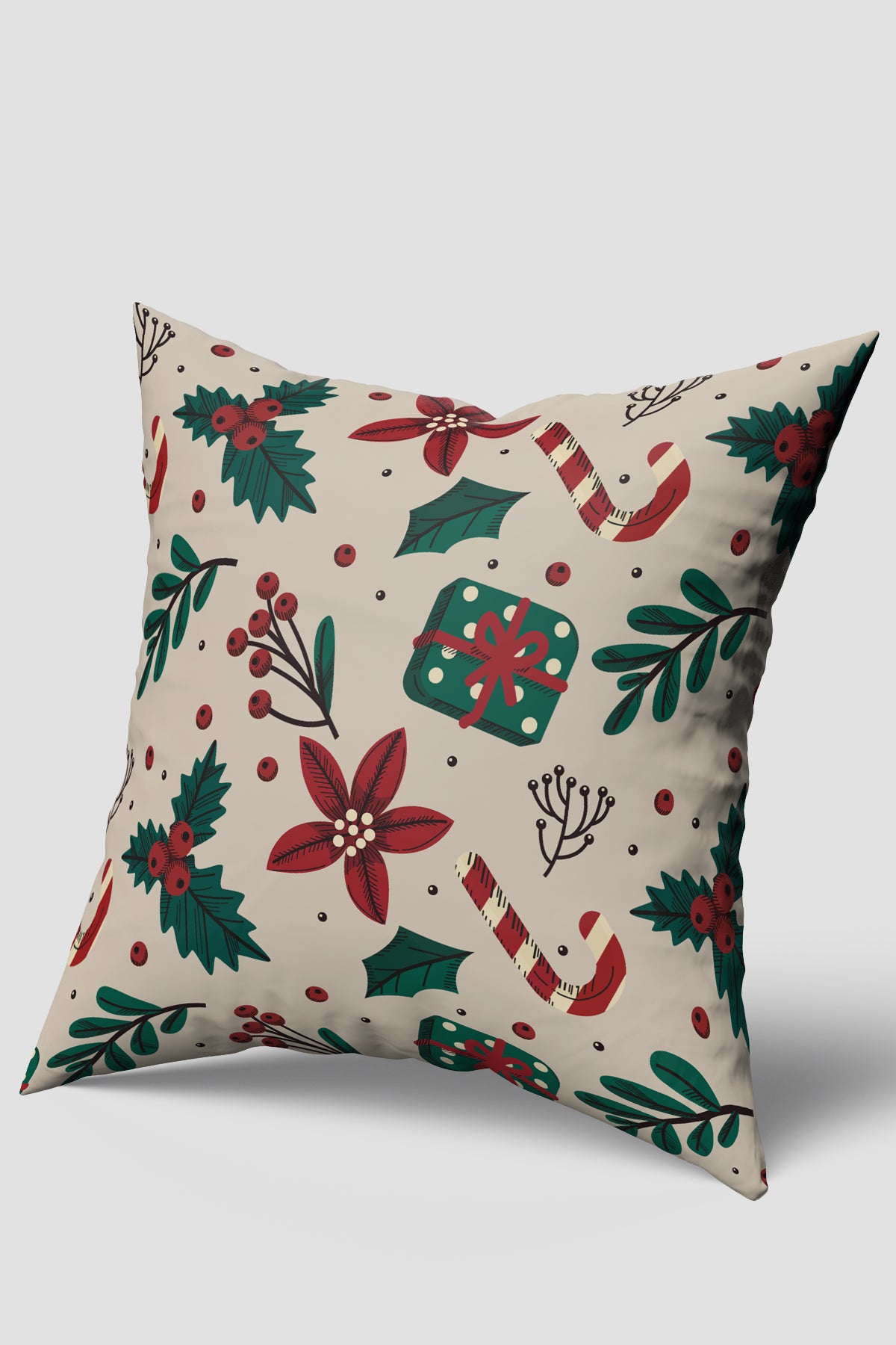 Bej Şeker ve Çiçek Desenli Yılbaşı Kırlent Kılıfı