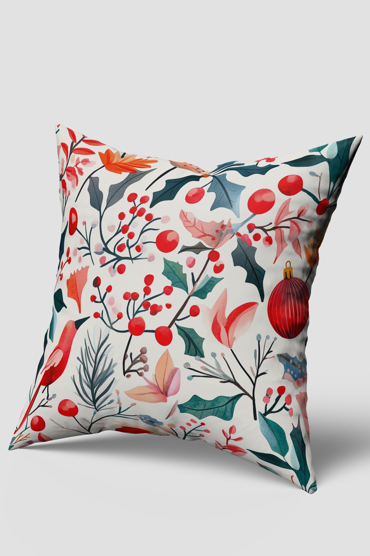 Açık bej veya kirli beyaz bir zemin üzerine, suluboya tekniğiyle çizilmiş yoğun ve doğal yılbaşı motifleriyle süslenmiş bir kırlent kılıfıdır. Desen, geleneksel kırmızı, yeşil ve beyaz tonlarını içeren, yaban mersinleri (berries), kutsal (holly) yaprakları, çam dalları ve kuş (kardinal) figürleri gibi kış bitki örtüsü öğeleriyle doludur. Ayrıca kırmızı bir yılbaşı topu detayı da bulunur. Zengin ve sanatsal bir görünüme sahip bu kılıf, mekana sıcak, doğal ve zarif bir yılbaşı atmosferi katmak için idealdir.