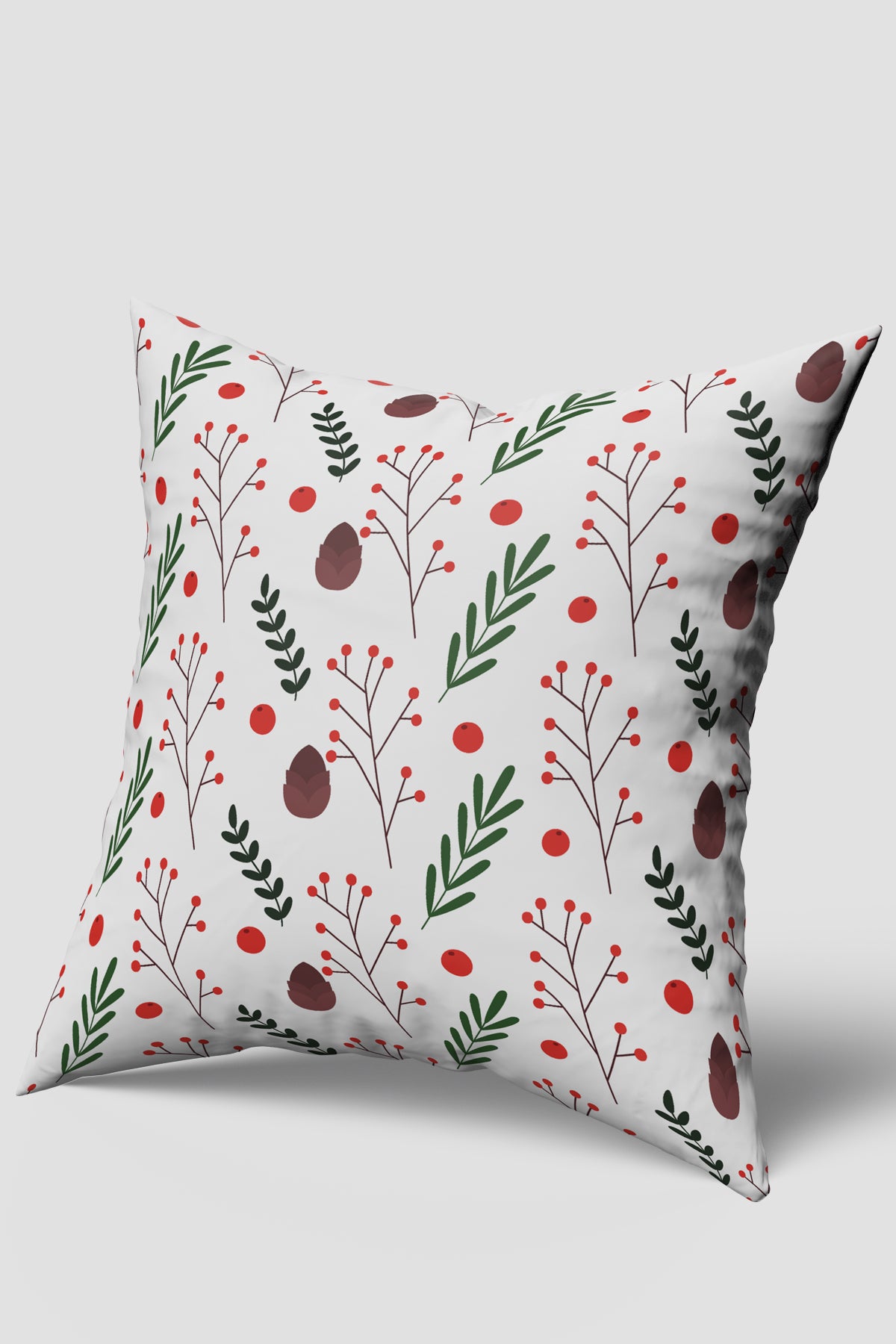 Hafif kirli beyaz veya krem tonlarında bir zemin üzerine, kış ve Noel konseptine uygun, doğal motiflerin tekrarlandığı bu dekoratif kırlent kılıfı, sade ve zarif bir tasarıma sahiptir. Desende, koyu yeşil renkteki çeşitli yaprak ve dal figürleri, ince kahverengi dallar üzerinde kırmızı meyveler ve bordo/kahverengi kozalak figürleri yer alarak, geleneksel kırmızı-yeşil renk paletiyle iç mekanlara doğal ve şenlikli bir dokunuş katmaktadır.