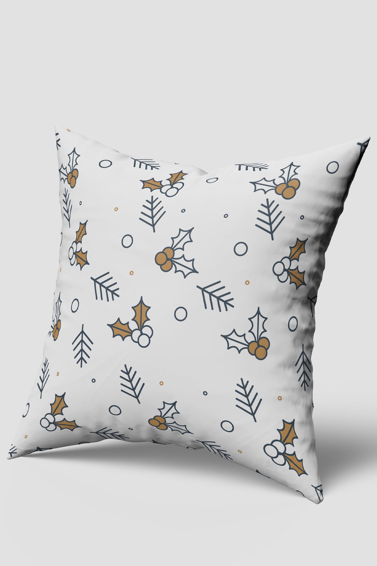 Hafif kirli beyaz bir zemin üzerine sade, minimal ve ikonik bir çizgi stiliyle tasarlanmış olan bu dekoratif yastık, Noel temalı bir desene sahiptir. Desende koyu lacivert (veya antrasit) renkte çam ağacı dalları ve yine koyu lacivert kontürlü, meyveleri metalik altın renginde olan çobanpüskülü (holly) dalları tekrar etmektedir; aralara serpiştirilmiş basit daireler ve noktalar, desene hareketli ve modern bir hava katmaktadır.