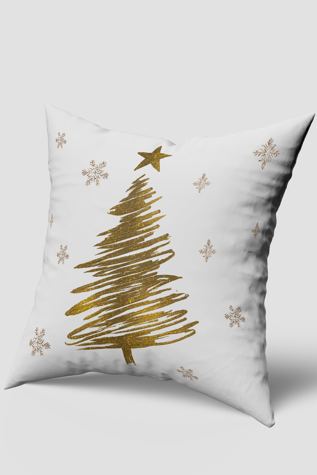 Temiz beyaz zemin üzerine, modern ve şık bir yılbaşı temalı tasarıma sahip kırlent kılıfıdır. Kılıfın merkezinde, fırça darbeleri veya karalamalarla oluşturulmuş hissi veren, ışıltılı altın renginde büyük bir çam ağacı figürü yer alır; ağacın tepesinde yine altın renginde bir yıldız bulunur. Ağacın etrafına serpiştirilmiş altın tonlarında narin kar tanesi motifleri, tasarıma zarif bir kış dokunuşu katar. Bu parça, minimalist renk paletiyle (beyaz ve altın) modern ve lüks bir yılbaşı şıklığı yaratmak isteyen dekorasyonlar için idealdir.