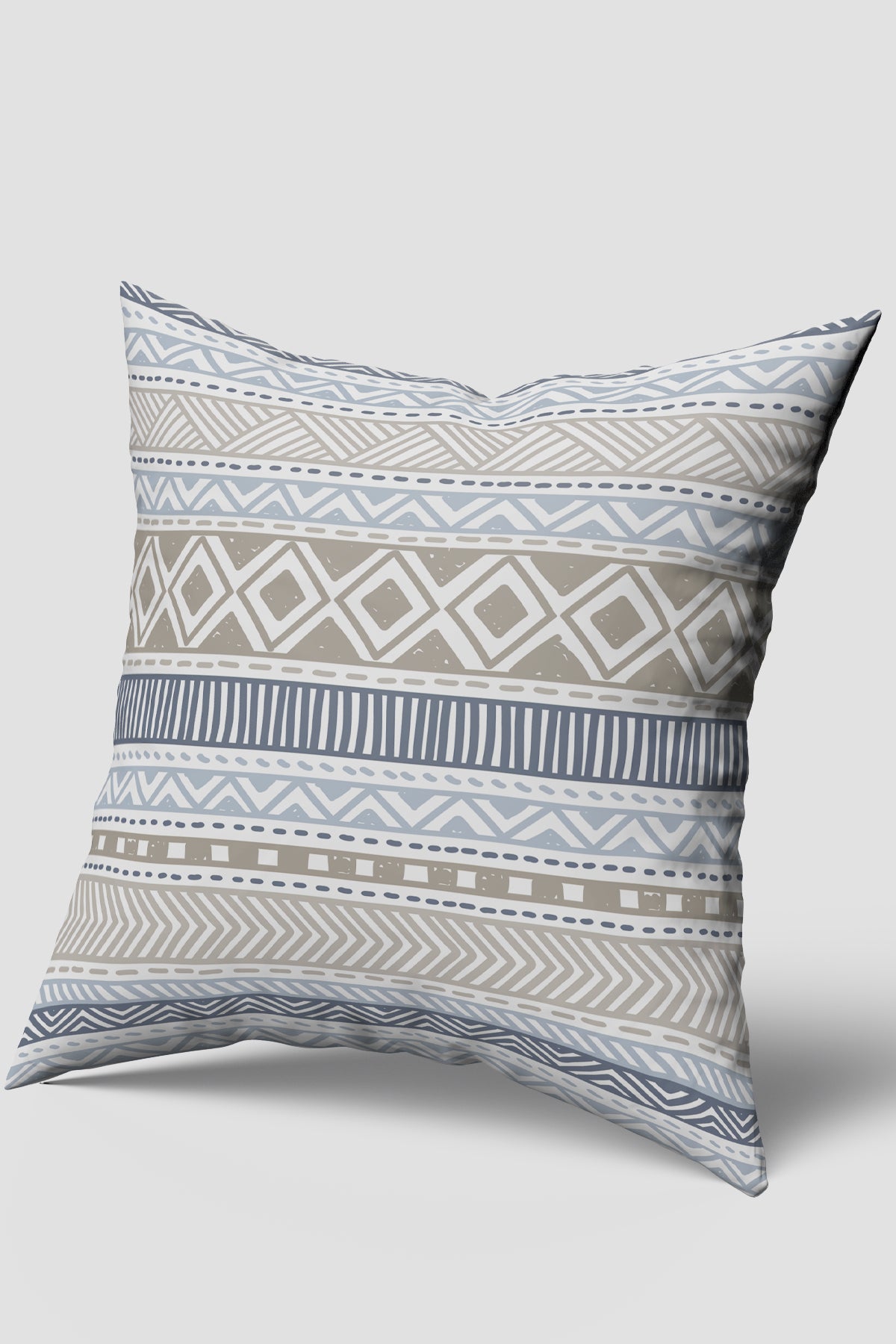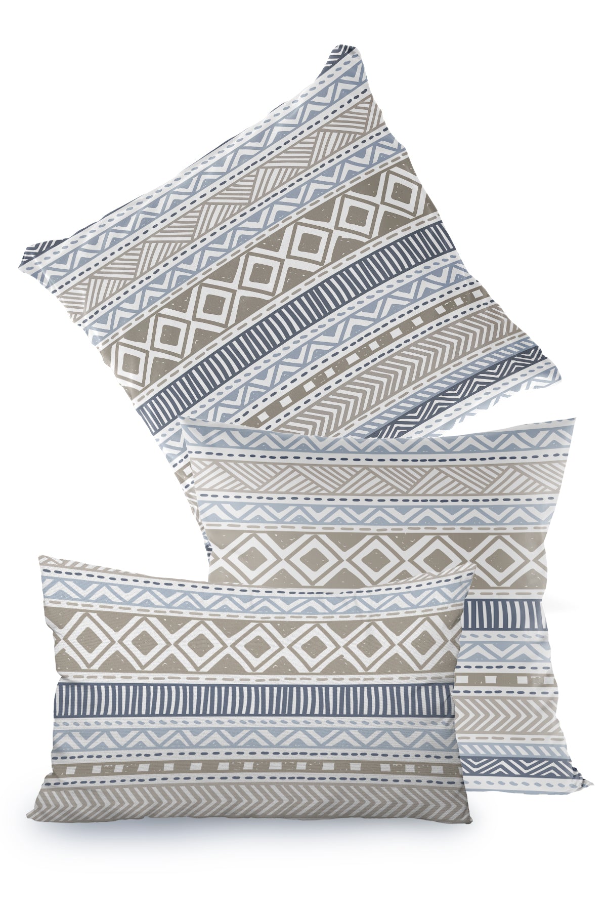 El çizimi hissi veren yatay şeritler halinde düzenlenmiş, bohem ve etnik desenlerle dikkat çeken bu kırlent kılıfı, nötr bir renk paleti olan bej, açık kahverengi, beyaz ve pastel mavi tonlarını kullanır. Çizgiler, zikzaklar, oklar ve elmas şeklindeki geometrik motifler, desene zengin bir doku ve derinlik katıyor. Mekanına huzurlu, doğal ve İskandinav veya bohem tarzı bir dokunuş eklemek isteyenler için mükemmel bir seçimdir.