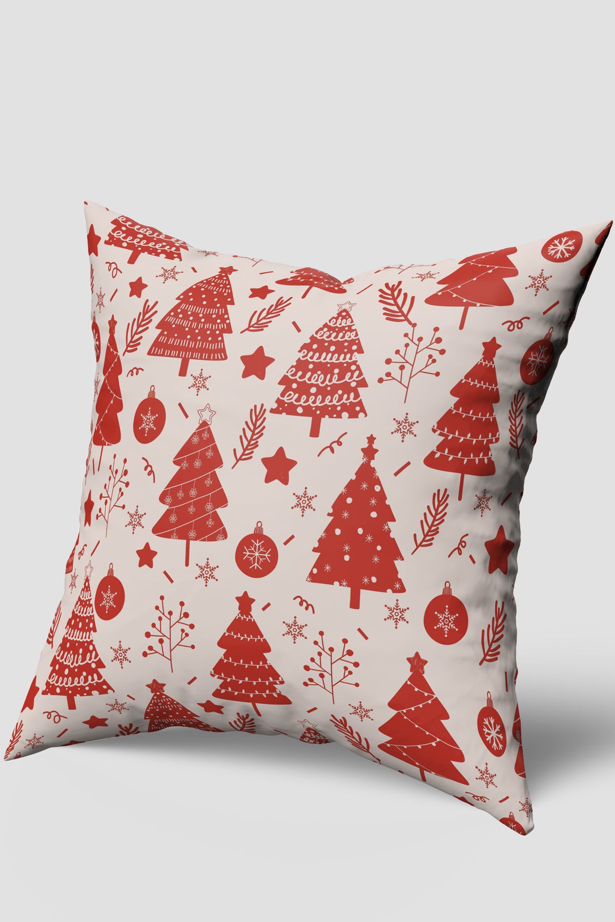 Açık krem veya bej tonlarındaki bir zemin üzerine, canlı kırmızı renkte çeşitli kış ve Noel motiflerinin tekrarlandığı bu dekoratif kırlent kılıfı, şenlikli ve sıcak bir tasarıma sahiptir. Desende, farklı süsleme ve çizim stillerine sahip stilize çam ağaçları, kar taneleri, yıldızlar ve yılbaşı topu figürleri gibi zengin öğeler bir araya gelerek neşeli ve geleneksel bir yılbaşı atmosferi yaratmaktadır.