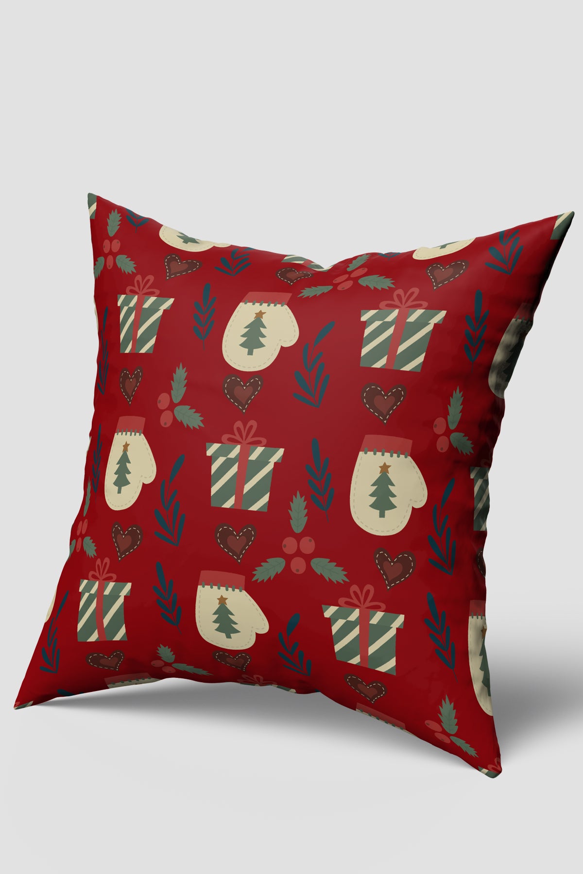 Canlı koyu kırmızı bir zemin üzerine, geleneksel Noel renk paletinde (krem, yeşil ve bordo tonları) rastgele tekrar eden desenlerle süslenmiş bu dekoratif kırlent kılıfı, şenlikli bir kış temasına sahiptir. Desende, çam ağacı figürlü krem rengi eldivenler, yeşil çizgili hediye kutuları, koyu yeşil yaprak ve çobanpüskülü (holly) dalları ile dikişli görünümlü kalpler gibi sembolik figürler yer alarak sıcak ve neşeli bir yılbaşı atmosferi yaratmaktadır.