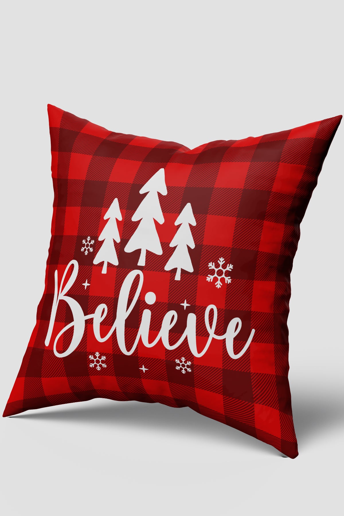 Canlı kırmızı ve koyu kırmızı tonlarındaki geleneksel kareli (buffalo check) desene sahip bu dekoratif kırlent kılıfı, Noel ve kış temasına uygun odak bir mesaja sahiptir. Ürünün üzerinde, beyaz renkte, akıcı el yazısıyla yazılmış büyük "Believe" (İnan) kelimesi ile çevresinde beyaz stilize çam ağacı ve kar tanesi figürleri yer almakta olup, klasik rustik desen ve neşeli mesajıyla şenlikli bir atmosfer yaratmaktadır.
