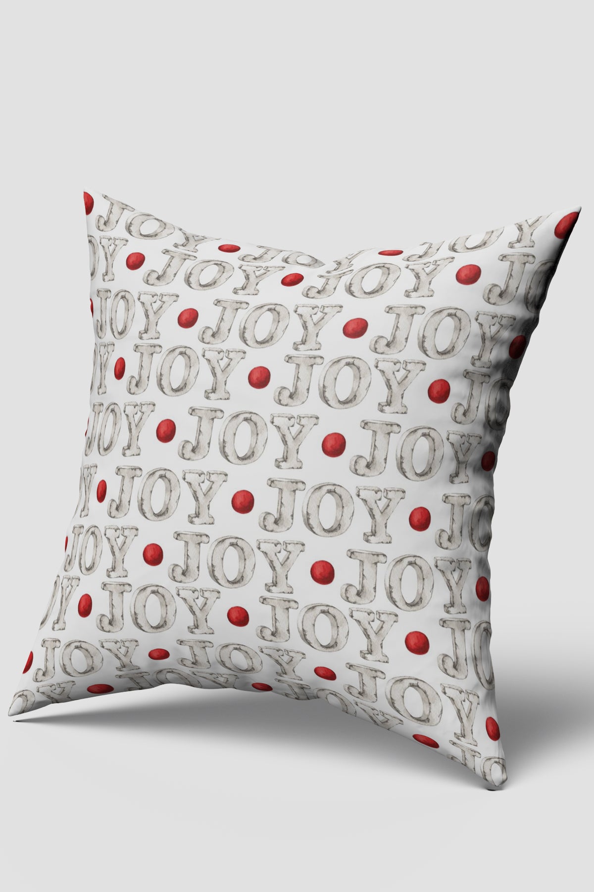 Açık beyaz bir zemin üzerine tasarlanan bu dekoratif kırlent kılıfı, kış ve Noel neşesini yansıtan bir desene sahiptir. Desende, buzlu veya karla kaplı görünümlü, beyaz ve gri tonlardaki büyük "JOY" (Sevinç/Neşe) kelimeleri tekrar ederken, aralarına serpiştirilmiş canlı kırmızı renkli yuvarlak figürler (meyve, çam topu veya boncuk gibi) çarpıcı bir kontrast oluşturarak şenlikli ve modern bir yılbaşı atmosferi katmaktadır.