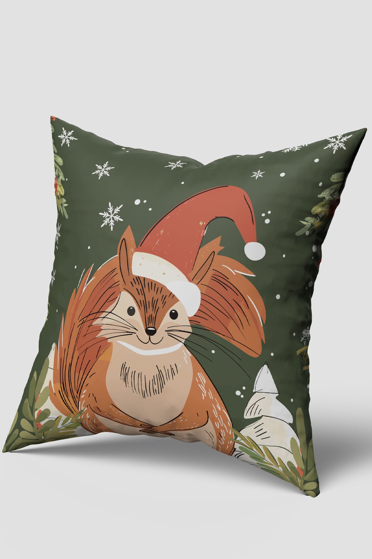 - Noel Temalı Yeşil Sevimli Sincap Desenli Yılbaşı Kırlent Kılıfı