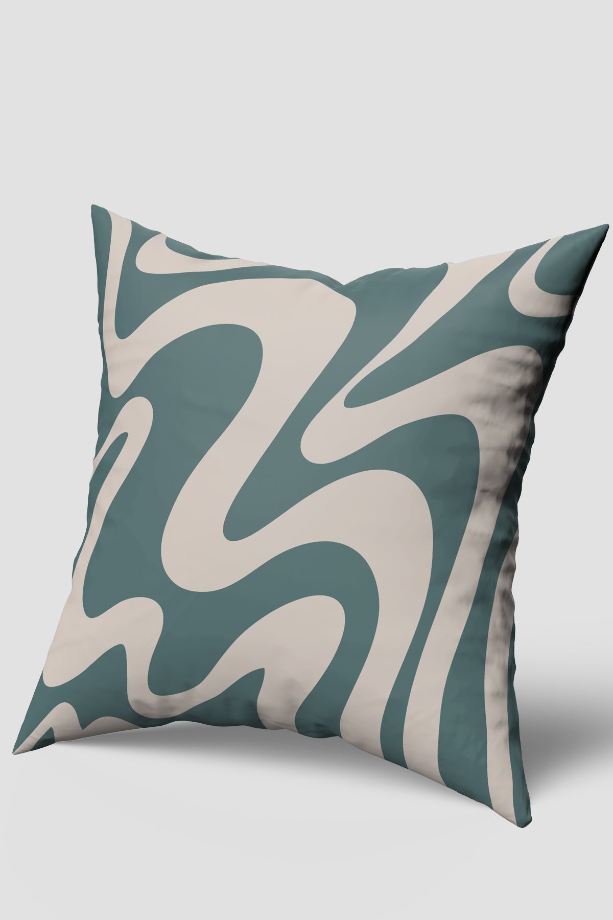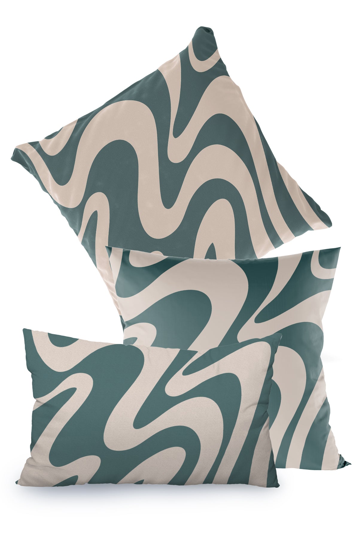 Yeşilimsi mavi (petrol mavisi) ve krem rengi ile oluşturulmuş bu kırlent kılıfı, retro ve modern bir havaya sahip akışkan dalgalı deseniyle dikkat çeker. Göz yanılsaması yaratan bu dinamik ve organik çizgiler, mekana anında hareket ve sanatsal bir derinlik katıyor. Dingin ama aynı zamanda cesur renk paleti sayesinde İskandinav, orta yüzyıl modern (mid-century modern) veya bohem tarzı dekorasyonlara huzurlu ve sofistike bir dokunuş eklemek için idealdir.
