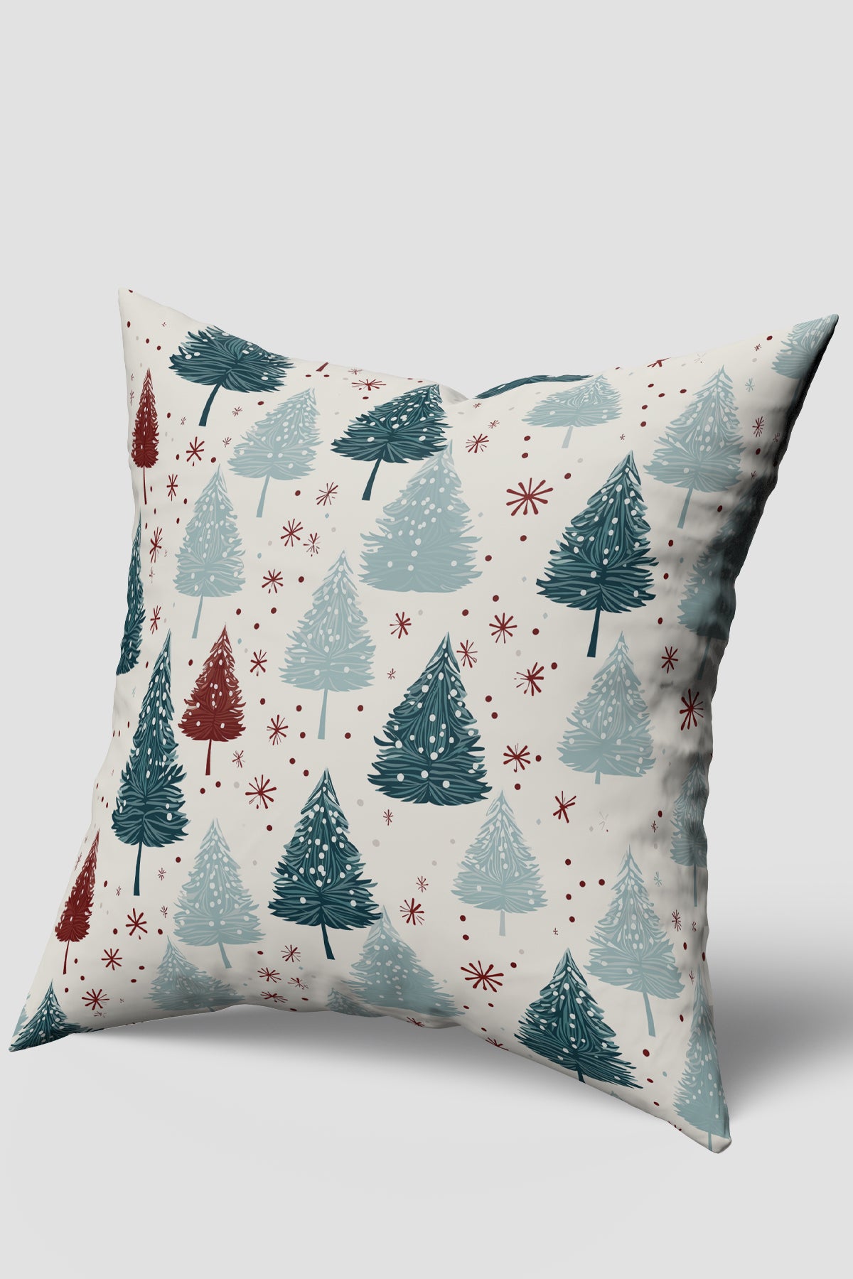 Açık bej veya krem rengi bir zemin üzerine, kış ve yılbaşı temalı çam ağacı motifleriyle süslenmiş modern bir kırlent kılıfıdır. Desen; soğuk mavi, lacivert ve bordo (kızıl) gibi geleneksel olmayan renklerde stilize edilmiş çam ağaçlarından oluşur. Ağaçların bazıları kar veya ışıklandırma detaylarına sahiptir ve aralarına küçük kar tanesi/yıldız motifleri serpiştirilmiştir. Bu kılıf, İskandinav ve modern dekorasyon tarzlarına uyum sağlayarak mekana sade, sofistike ve çağdaş bir kış/yılbaşı havası katmak için idealdir.
