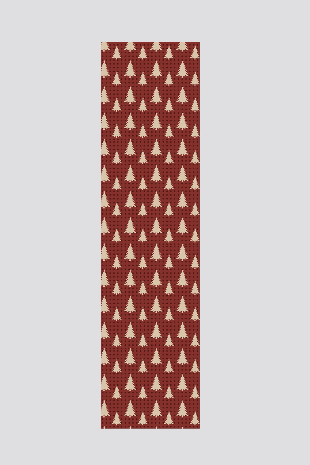 Kızıl-kahve (bordo veya kiremit) tonlarında bir zemin üzerine, sade ve düzenli bir şekilde sıralanmış, bej veya açık kahverengi stilize çam ağacı motiflerine sahip bir dekoratif örtüdür. Ağaçların aralarına serpiştirilmiş küçük koyu kahverengi puantiye deseni, tasarıma dinamik ve eğlenceli bir hava katarken, genel olarak retro ve İskandinav esintili bir kış şıklığı sunar. Bu parça, geleneksel tatil renklerinden uzaklaşarak daha sıcak ve sofistike bir kış dekorasyonu yaratmak isteyenler için idealdir.