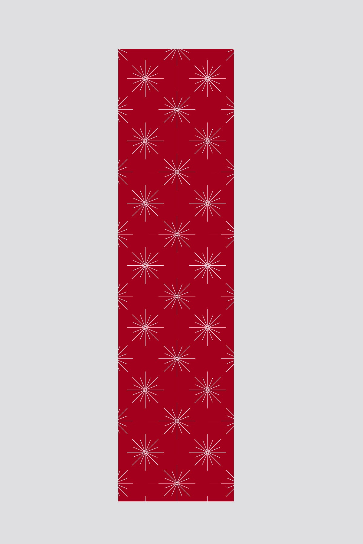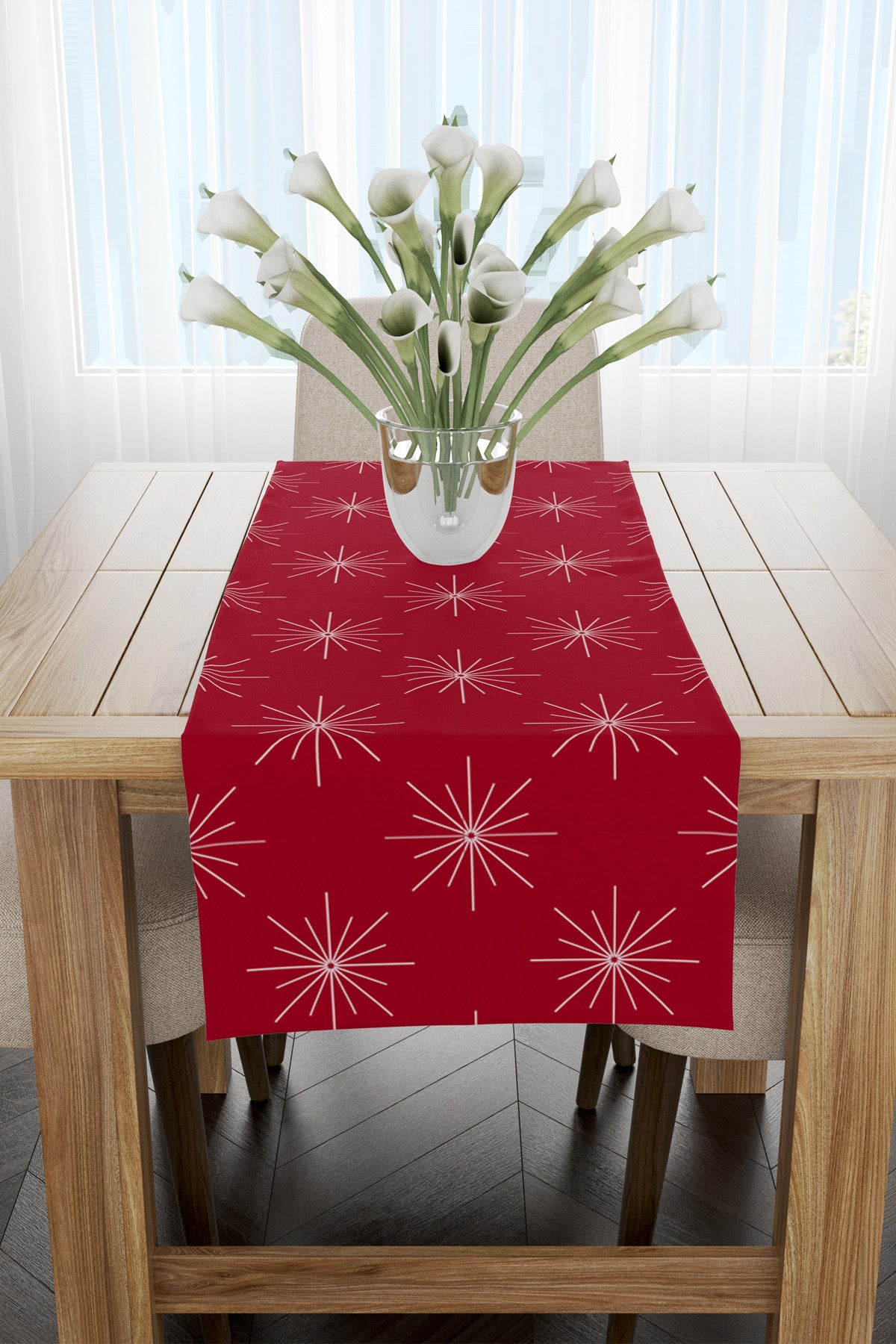 Canlı ve göz alıcı kırmızı bir zemin üzerine, minimalist ve modern bir tasarıma sahip dekoratif örtüdür. Örtü, bembeyaz ve ince çizgilerden oluşan stilize edilmiş kar tanesi veya yıldız patlaması (starburst) motifleriyle süslenmiştir. Bu desen, 1950'lerin ortası yüzyıl modern (Mid-Century Modern) stilini yansıtırken, canlı kırmızı rengi sayesinde klasik Noel ve kış enerjisini modern bir zarafetle birleştirir. Bu parça, masasına sade ama etkileyici bir tatil şıklığı katmak isteyenler için mükemmeldir.
