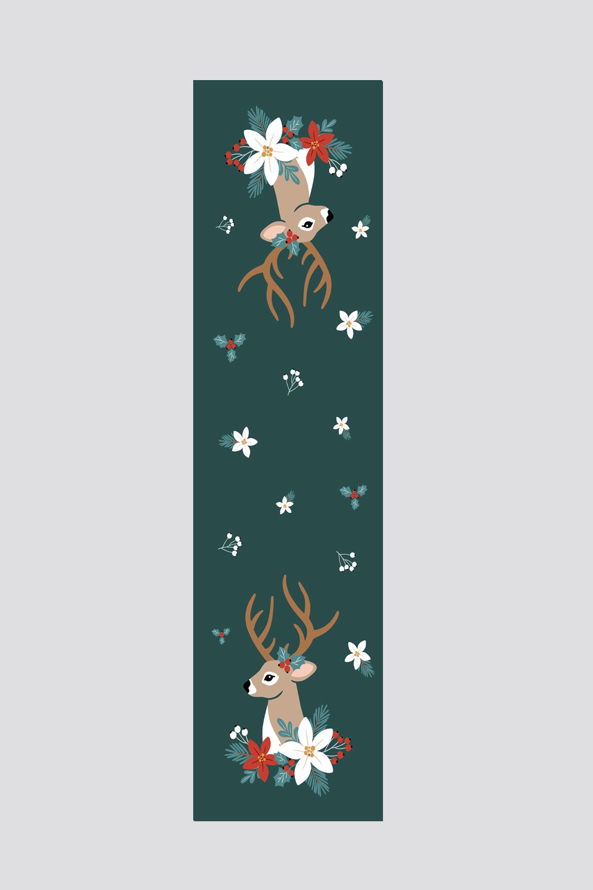 Koyu çam yeşili veya lacivert-yeşil tonlarında bir zemin üzerine, merkezi bir kış ve yılbaşı temalı figürle süslenmiş bir masa runner'ıdır. Runner'ın alt kısmında, sade ve modern bir illüstrasyon tarzında çizilmiş bir ren geyiği (geyik) başı yer alır. Geyik, boynunun altında kırmızı ve beyaz yılbaşı çiçekleri (puanliyetleri anımsatan), kutsal (holly) yaprakları ve kırmızı meyvelerden oluşan zengin bir kış buketi ile çevrelenmiştir. Üst kısımda ise küçük kar tanesi ve yaban mersini dalları serpiştirilmiştir. Bu dekoratif örtü, masanıza modern, sevimli ve odak noktası olabilecek zarif bir yılbaşı havası katmak için idealdir.