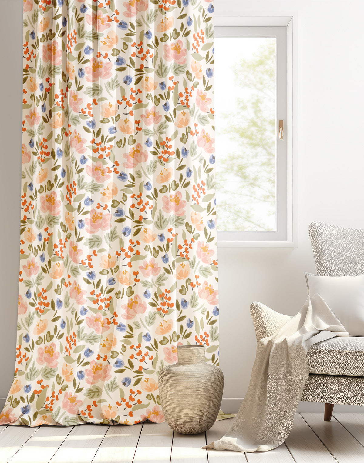 Mekânınıza yumuşak, neşeli ve huzurlu bir hava katacak bu fon perde, el yapımı sulu boya tekniğini andıran sevimli kır çiçekleri ve meyve desenleriyle tasarlanmıştır. Bej/krem rengi zemin üzerinde; şeftali, mercan, soluk mavi ve pastel yeşil tonlarının kullanıldığı bu desen, pencerenize zarif ve samimi bir dokunuş getirir. "Cottagecore", "Shabby Chic" veya modern çiftlik evi gibi romantik ve doğal dekorasyon stilleri için idealdir. Yüksek kaliteli kumaşı ve narin renk geçişli baskısıyla dingin bir estetik sunan bu perde, özellikle yatak odaları, bebek/çocuk odaları ve aydınlık salonlar için mükemmel bir seçimdir.