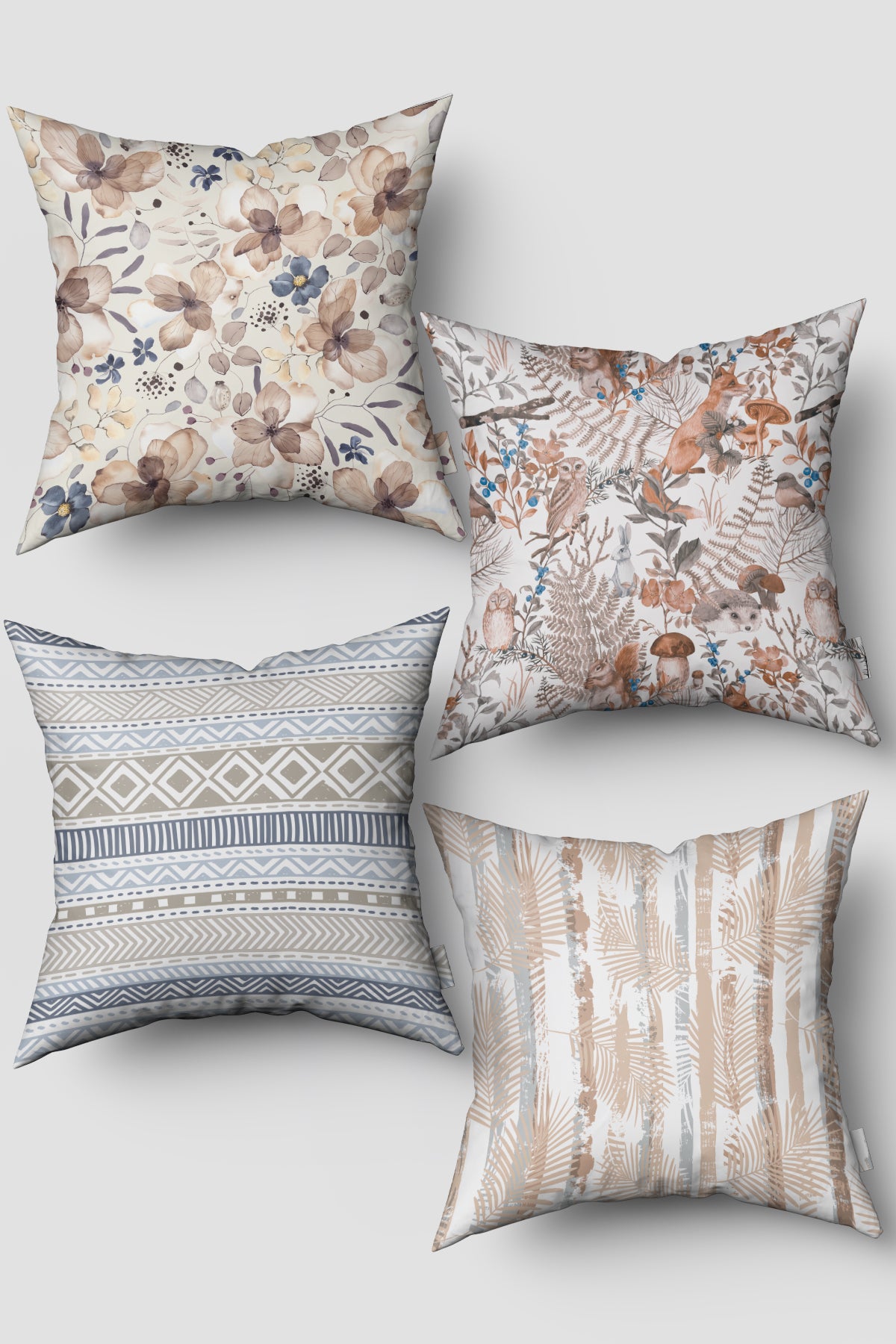 - Bohem Botanik Çiçek Desenli 4'lü Kırlent Kılıfı Seti 50x50cm