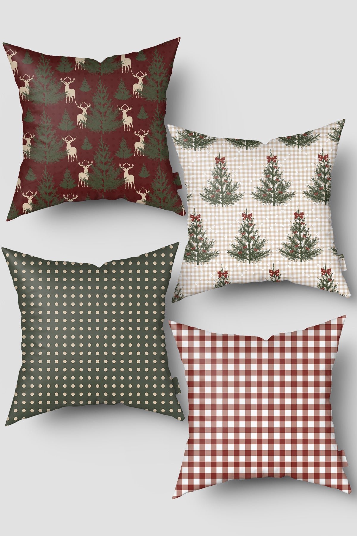 Bordo Yeşil Pötikare ve Çam Ağacı Yılbaşı 4'lü Kırlent Kılıfı Seti