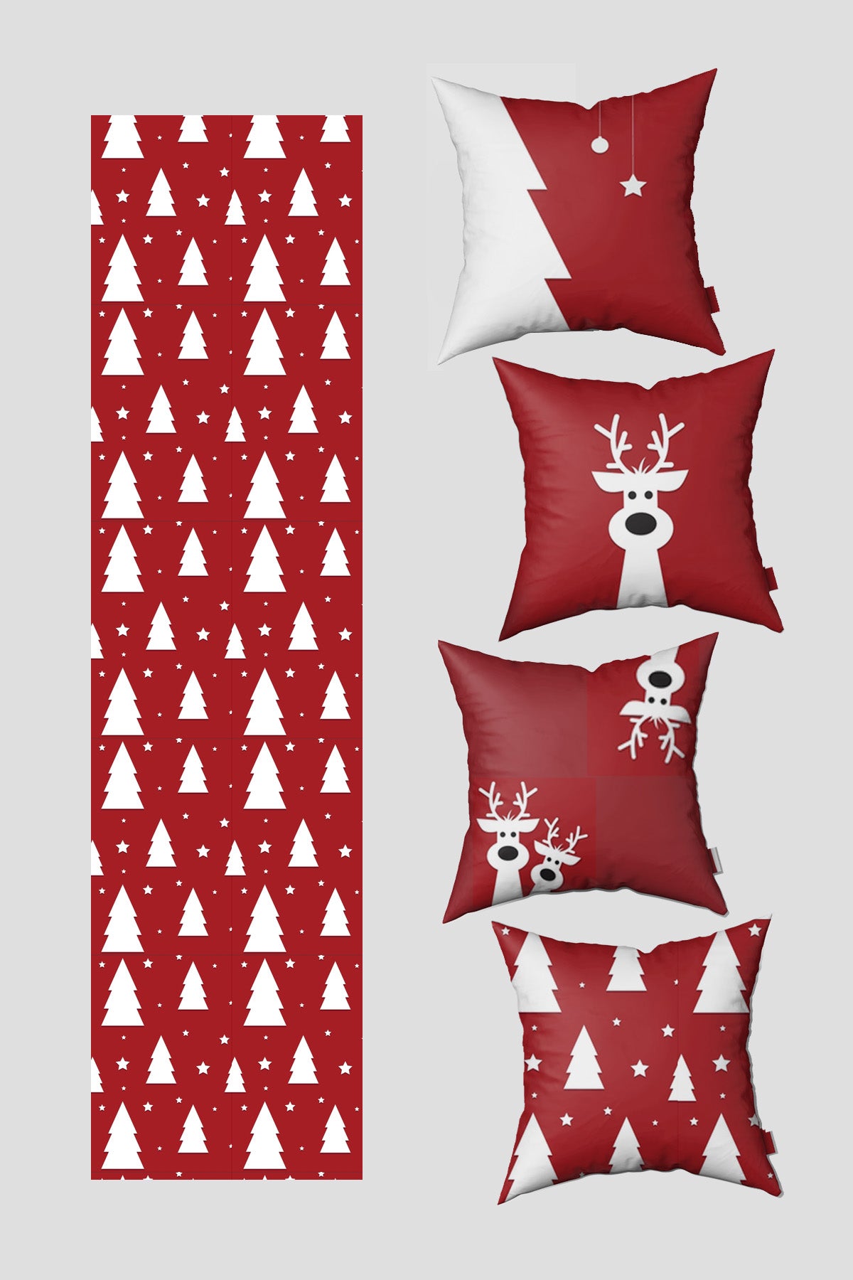 - Kırmızı Beyaz Ren Geyiği ve Çam Ağacı Yılbaşı 4 Kırlent Kılıfı 1 Runner Seti