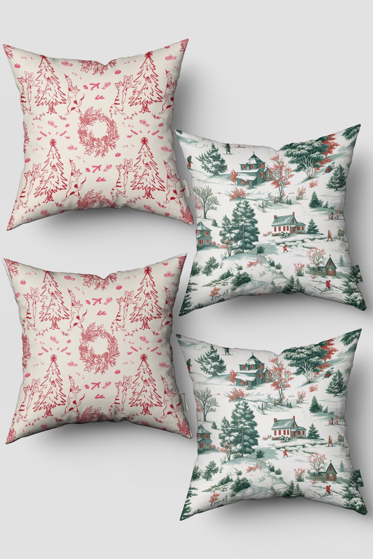 - Kırmızı Yeşil Kedi ve Kış Temalı 4'lü Kırlent Kılıfı Seti