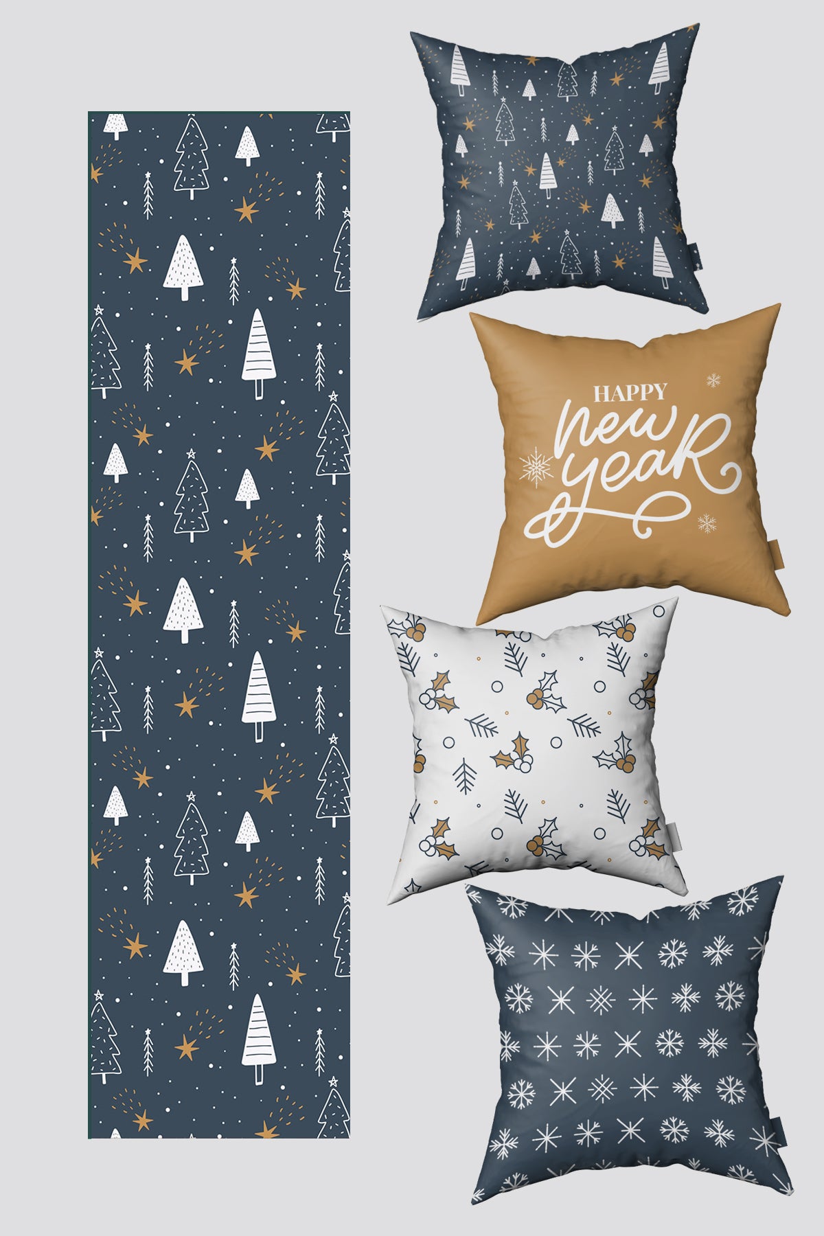 - Lacivert Sarı Çam Ağacı ve Kar Taneleri Yılbaşı 4 Kırlent Kılıfı 1 Runner Seti
