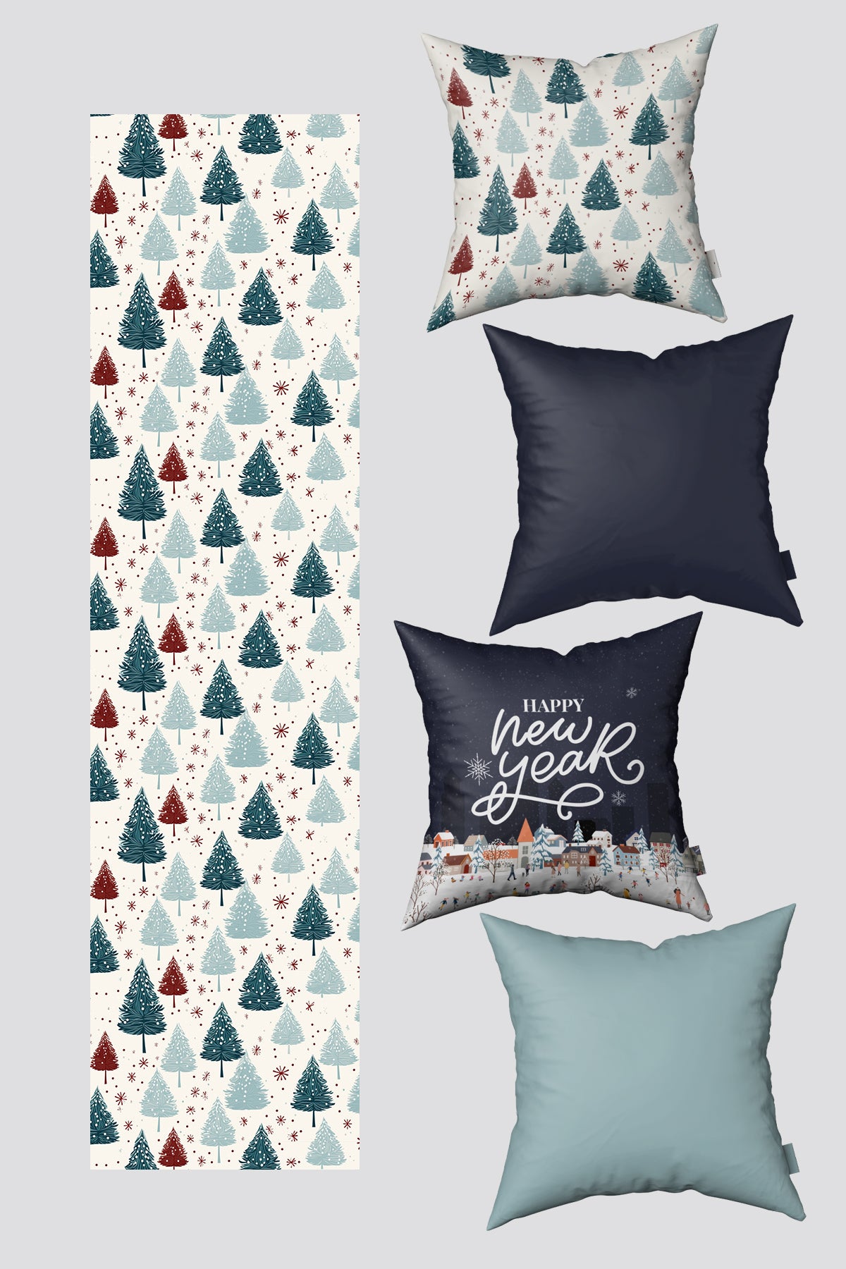 Lacivert Yeşil Çam Ağacı Yılbaşı 4 Kırlent Kılıfı 1 Runner Seti