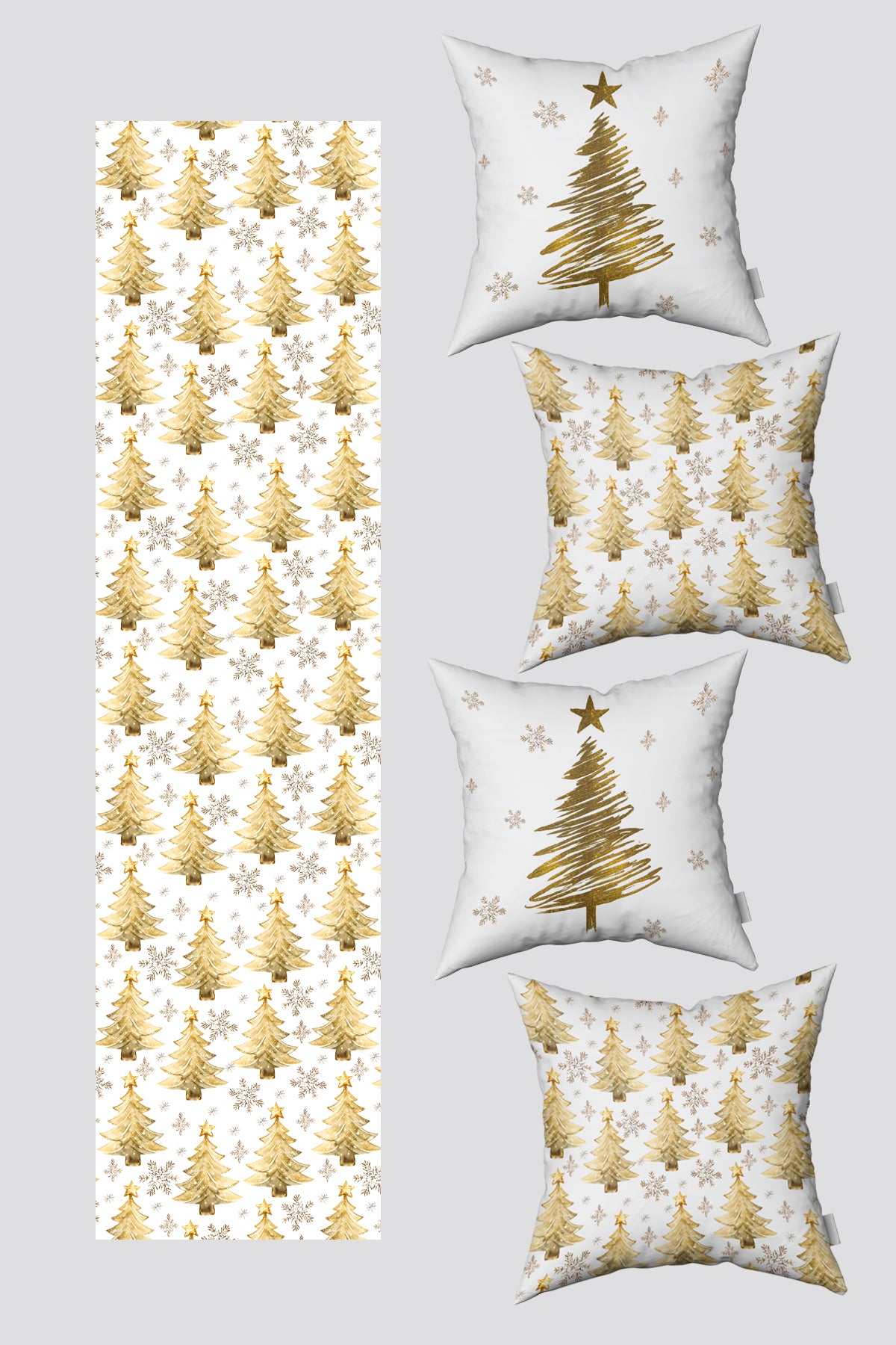 Noel Temalı Beyaz Işıltılı Sarı Çam Ağacı ve Kar Taneleri Yılbaşı 4 Kırlent Kılıfı 1 Runner Seti
