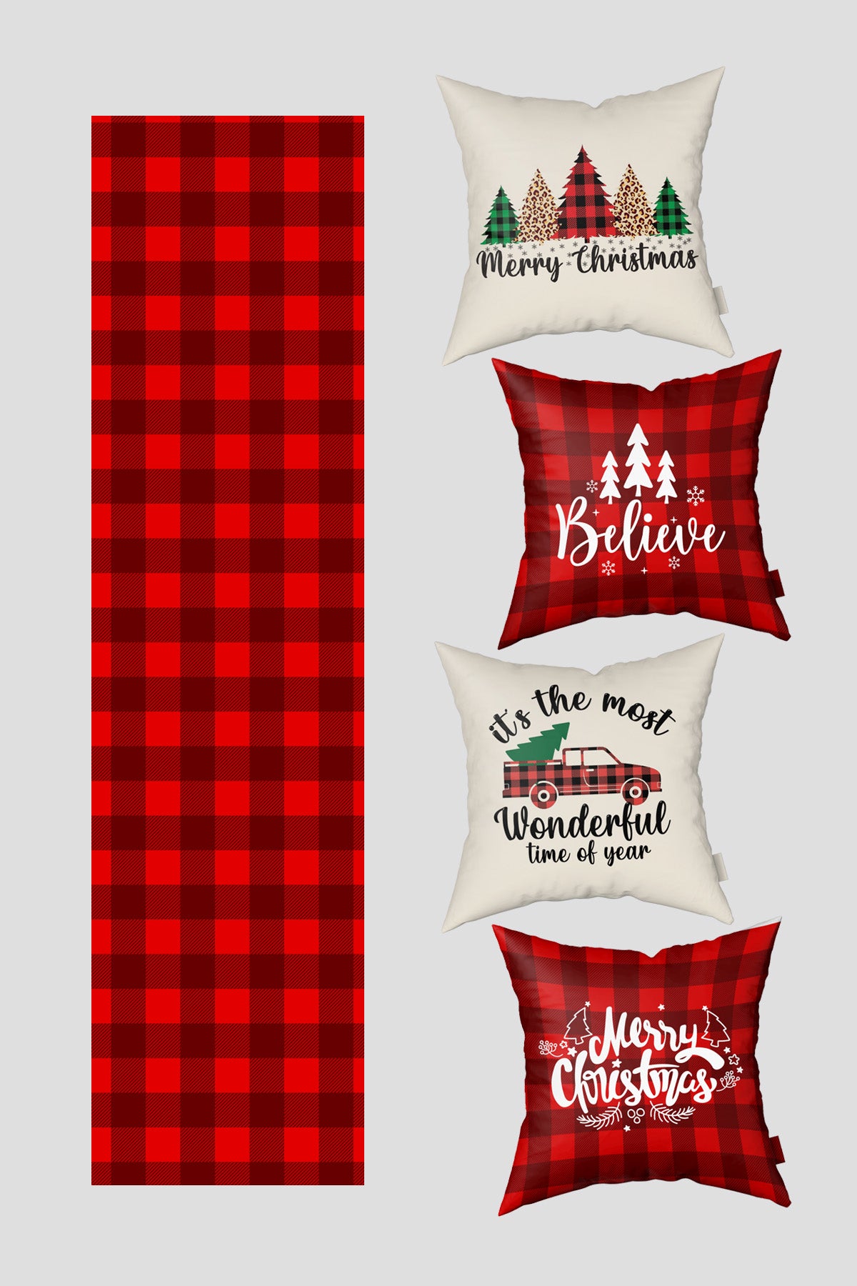 - Noel Temalı Kırmızı Bej Ekose ve Çam Ağacı Yılbaşı 4 Kırlent Kılıfı 1 Runner Seti