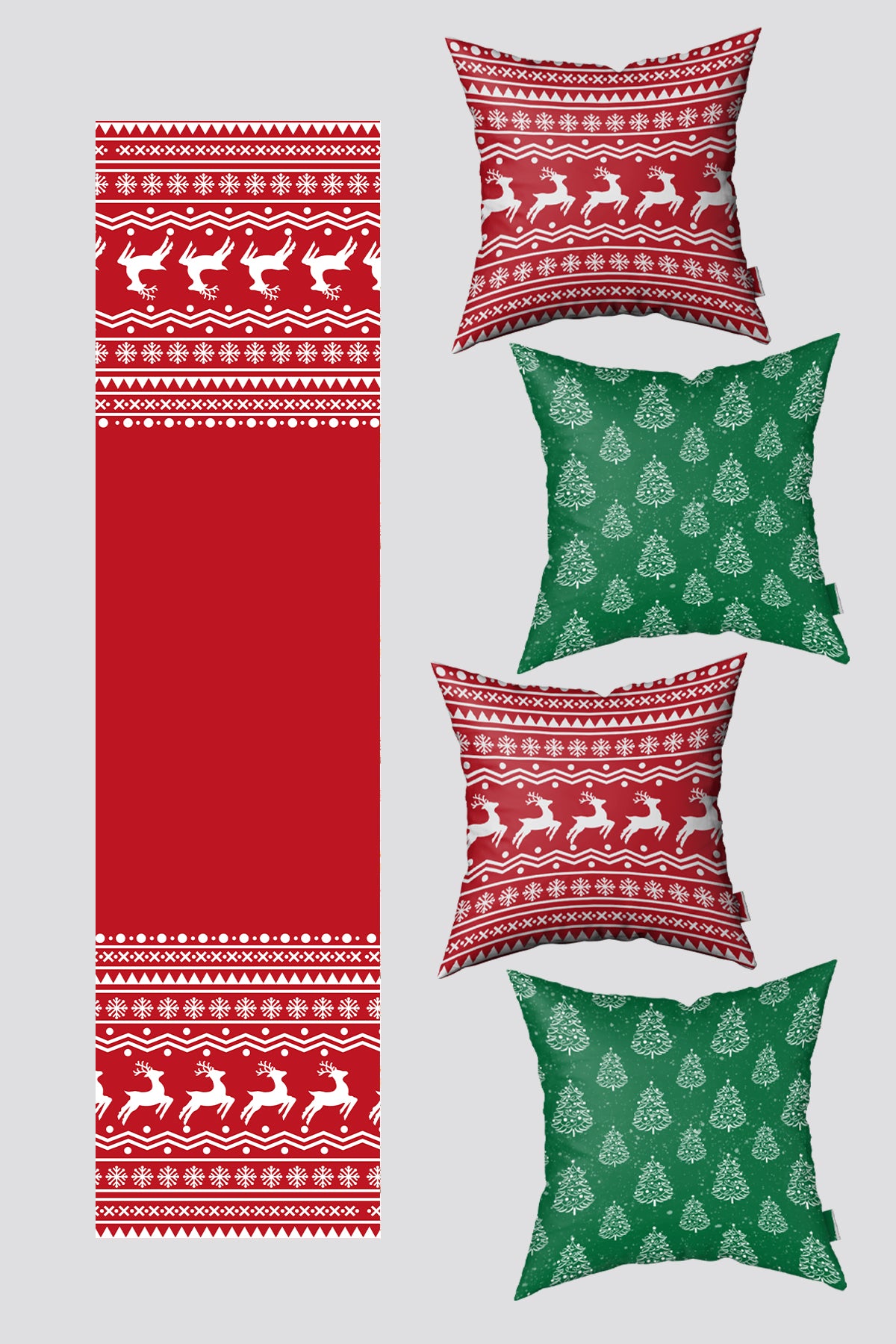 - Noel Temalı Yeşil Kırmızı Çam Ağacı ve Ren Geyiği Yılbaşı 4 Kırlent Kılıfı 1 Runner Seti