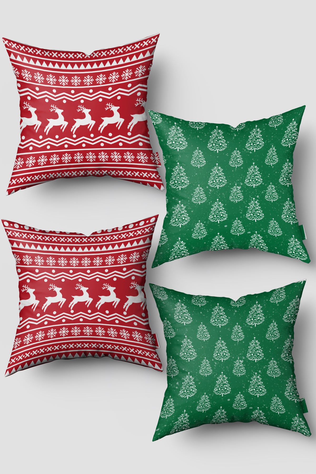 - Noel Temalı Yeşil Kırmızı Çam Ağacı ve Ren Geyiği Yılbaşı 4'lü Kırlent Kılıfı Seti