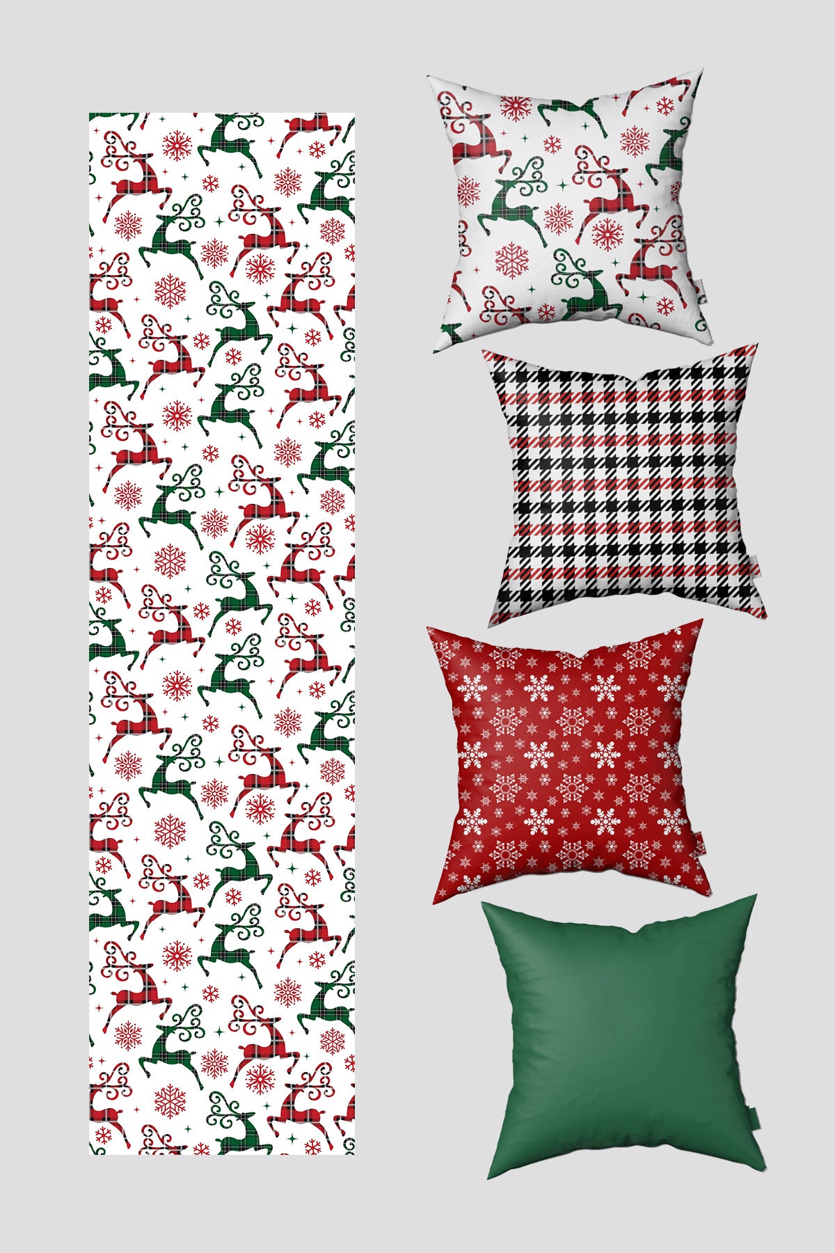 - Noel Temalı Yeşil Kırmızı Kazayağı ve Kar Taneleri Yılbaşı 4 Kırlent Kılıfı 1 Runner Seti