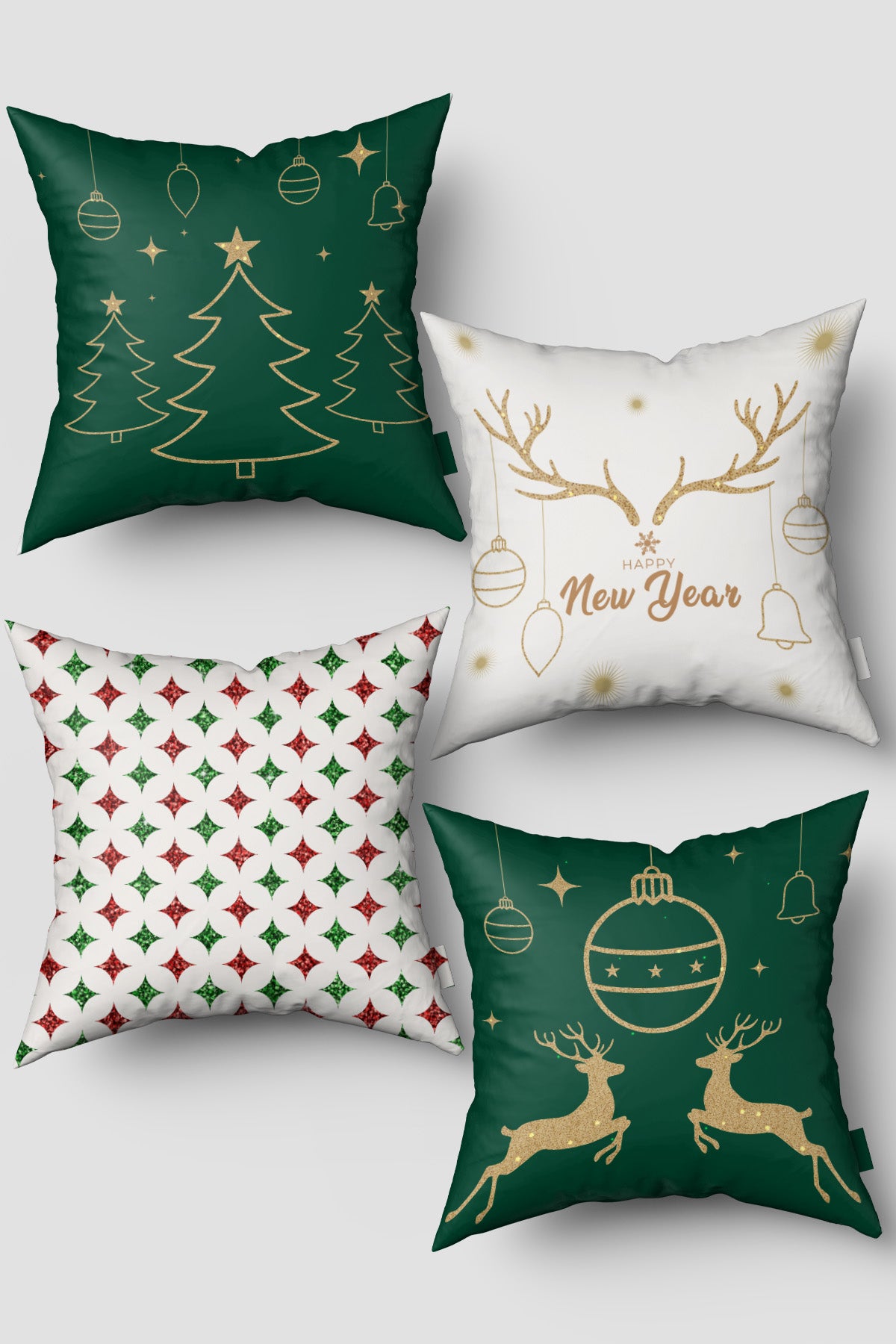 - Yeşil Beyaz Çam Ağacı ve Ren Geyiği Yılbaşı 4'lü kırlent Kılıfı Seti