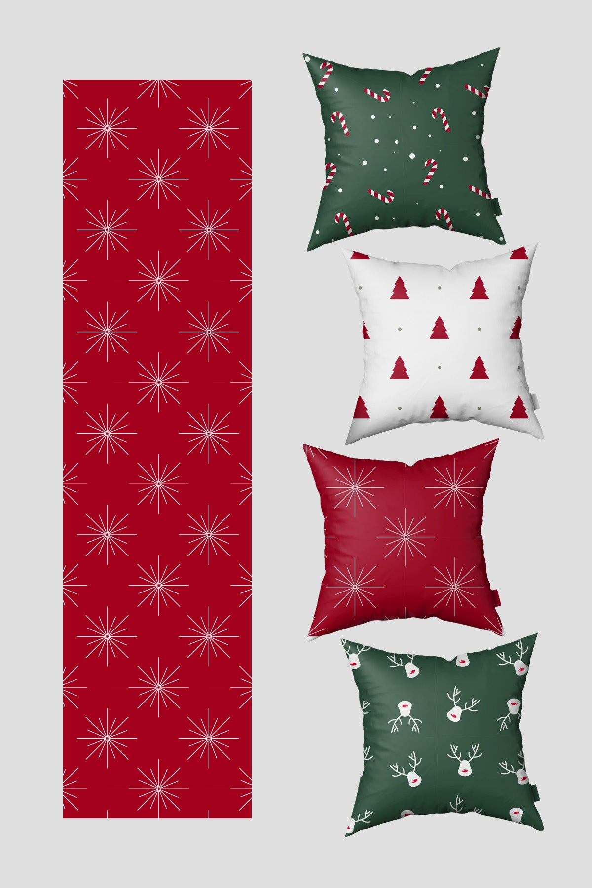 - Yeşil Kırmızı Çam Ağacı ve Baston Şeker Yılbaşı 4 Kırlent Kılıfı 1 Runner Seti