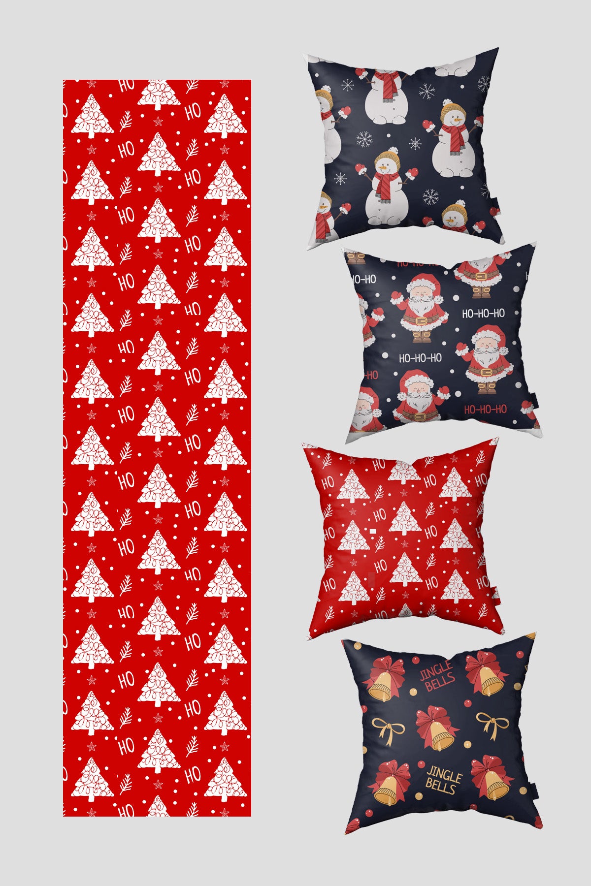 - Yeşil Kırmızı Çam Ağacı ve Baston Şeker Yılbaşı 4 Kırlent Kılıfı 1 Runner Seti