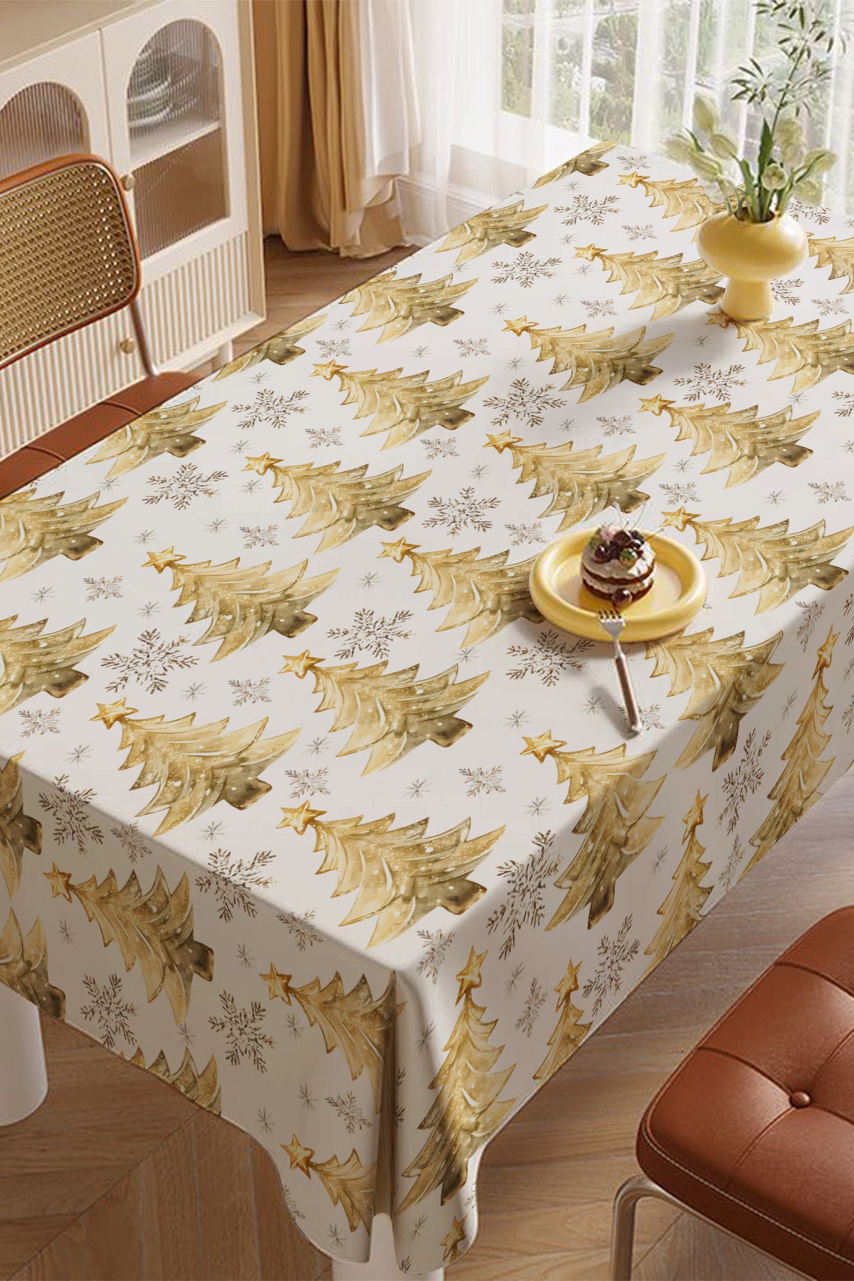 Bu lüks ve parlak masa örtüsü, altın renginin zarafetini bayram coşkusuyla birleştirir; açık krem veya bej zemin üzerine düzenli aralıklarla yerleştirilmiş olan desen, sanatsal ve suluboya görünümlü altın rengi çam ağaçları ile zarif bir şekilde serpiştirilmiş altın ve beyaz kar tanesi motiflerinden oluşur. Geleneksel kırmızı-yeşil temadan uzaklaşarak şıklığı ön plana çıkaran bu örtü, özellikle yılbaşı ve Noel kutlamalarında sofistike, ışıltılı ve göz kamaştırıcı bir masa düzeni oluşturmak isteyenler için mükemmel bir seçimdir.