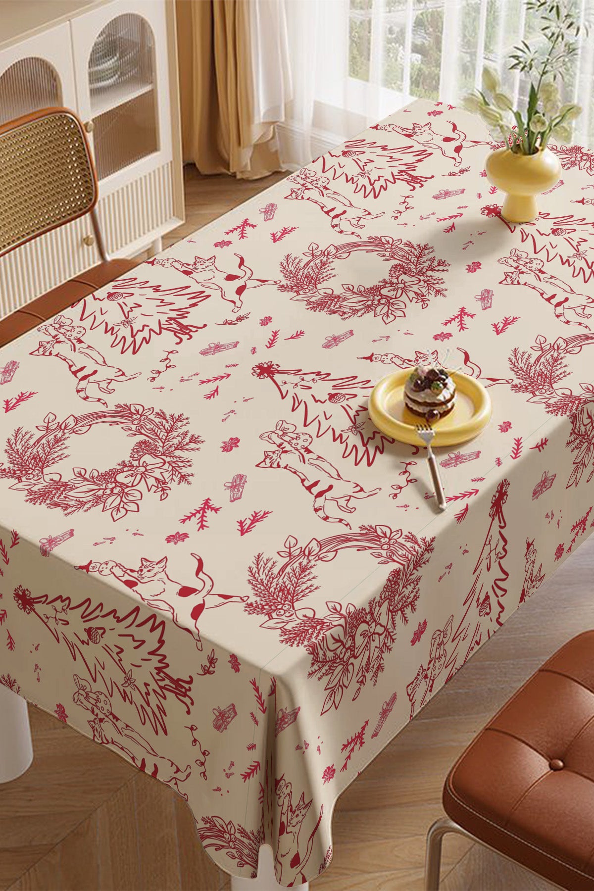 Bu benzersiz ve sevimli masa örtüsü, klasik Toile de Jouy tarzından ilham alan, ancak modern ve mizahi bir Noel teması taşıyan bir desene sahiptir; açık bej zemin üzerine tek renkli kırmızı çizgi (eskiz) tarzında işlenmiş olan desen, yaramaz kedilerin yılbaşı çelenkleriyle ve çam ağaçlarıyla oynadığı komik sahneleri tasvir ederken, etrafta serpiştirilmiş küçük yaprak ve çam dalları detaylarıyla zenginleştirilmiştir. Klasik estetiği eğlenceli ve hayvansever bir yorumla birleştiren bu örtü, özellikle kedi severler ve mizah dolu bir bayram dekorasyonu arayanlar için idealdir.