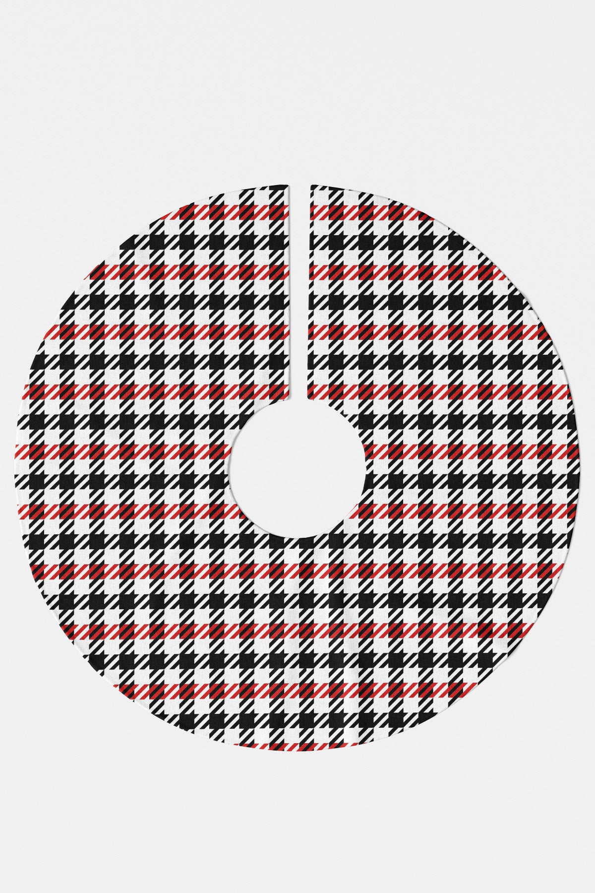 Klasik şıklığı yılbaşı coşkusuyla buluşturan bu ağaç altı eteği, ikonik Houndstooth (Tavukayağı) deseninin modern bir yorumunu sunar. Siyah ve beyazın zamansız zarafetine, tatil temasına uygun olarak canlı kırmızı çizgilerin eklenmesiyle çarpıcı bir kontrast yaratılmıştır. Bu sofistike desen, yılbaşı ağacınızın altına keskin, şık ve göz alıcı bir dokunuş katarken, hediye sunumunuz için lüks ve düzenli bir zemin sağlar. Klasik ve çağdaş dekorasyonları sevenler için ideal bir tercihtir.