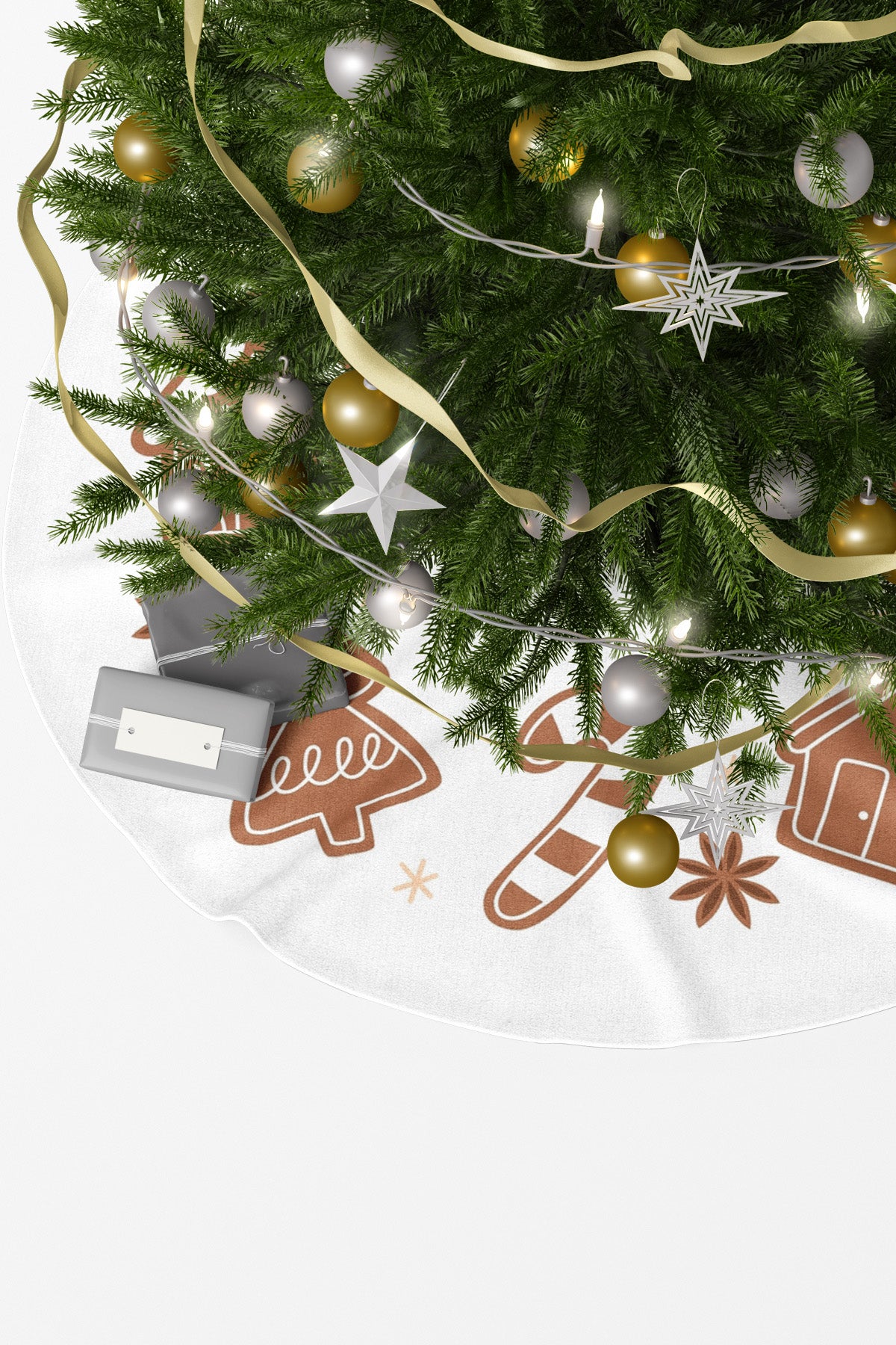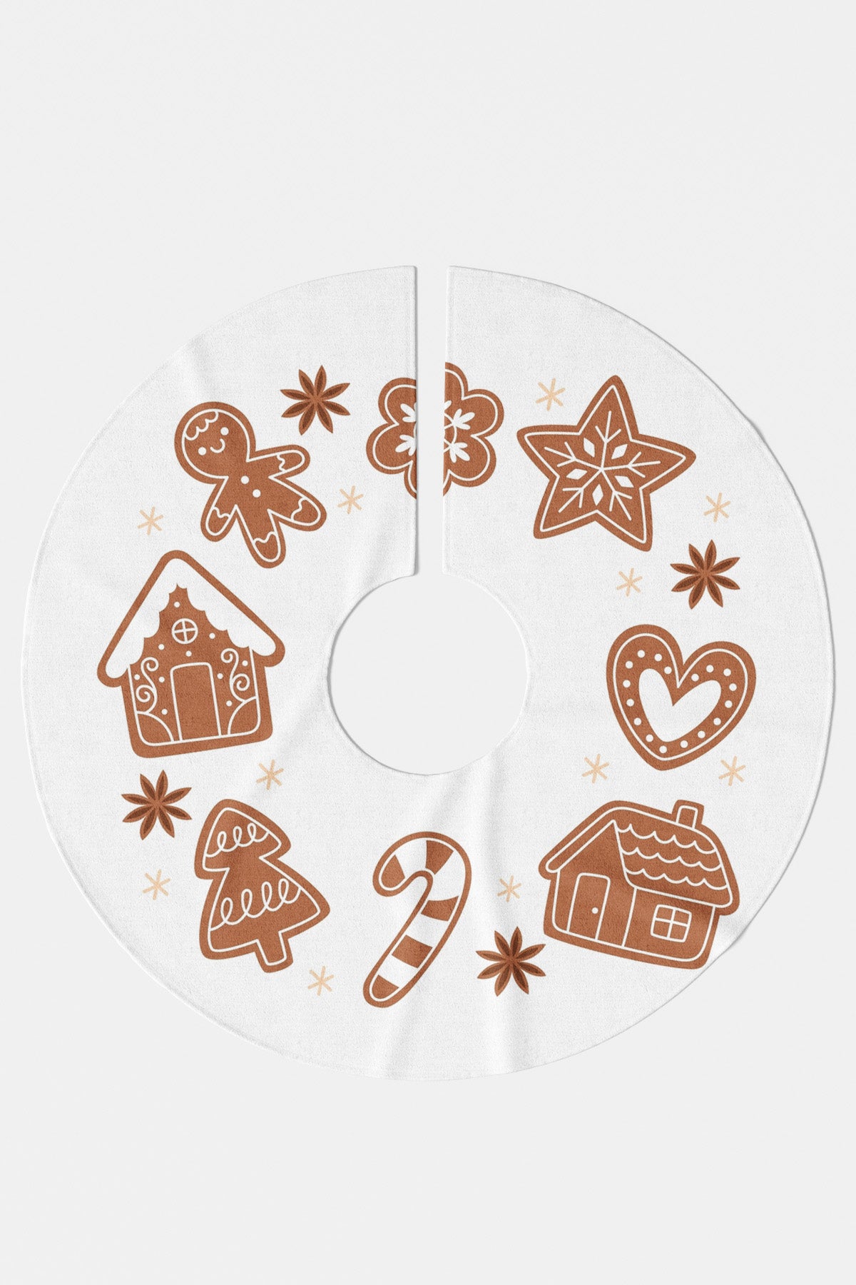 Yılbaşı ağacınızın altına tatlı ve geleneksel bir hava katacak bu ağaç altı eteği, bembeyaz zemin üzerinde sevimli zencefilli kurabiye (gingerbread) temalı motiflerle tasarlanmıştır. Desen, kahverengi ve beyaz konturlarla çizilmiş zencefilli kurabiye adam, çam ağacı, baston şeker ve kurabiye ev figürlerinden oluşur. Bu sade, sıcak ve neşeli tasarım, mutfak veya oturma odası gibi alanlardaki yılbaşı dekorasyonunuza samimi ve geleneksel bir dokunuş katmak için idealdir. Hediye sunumunuz için tatlı bir zemin oluşturur.