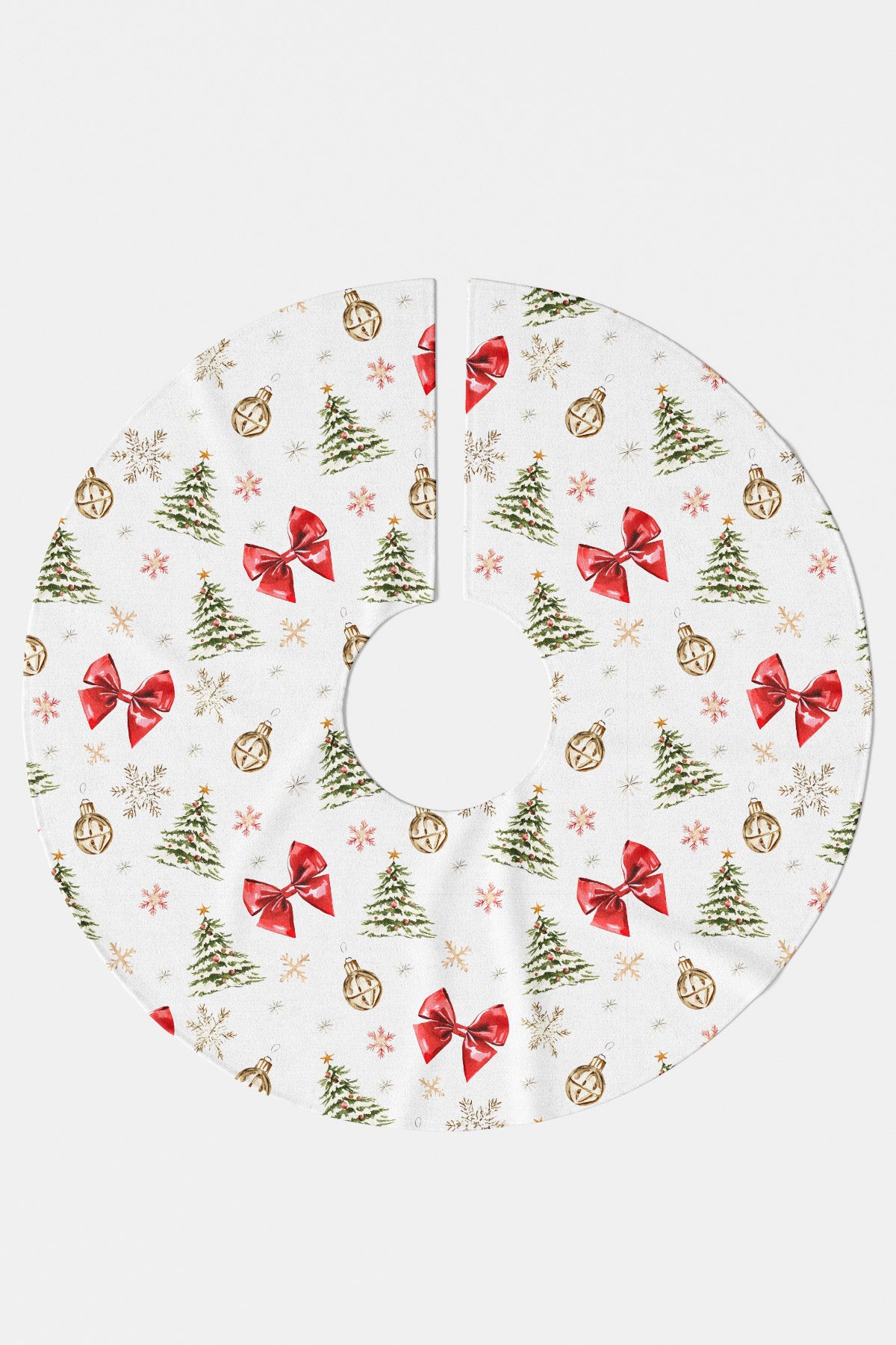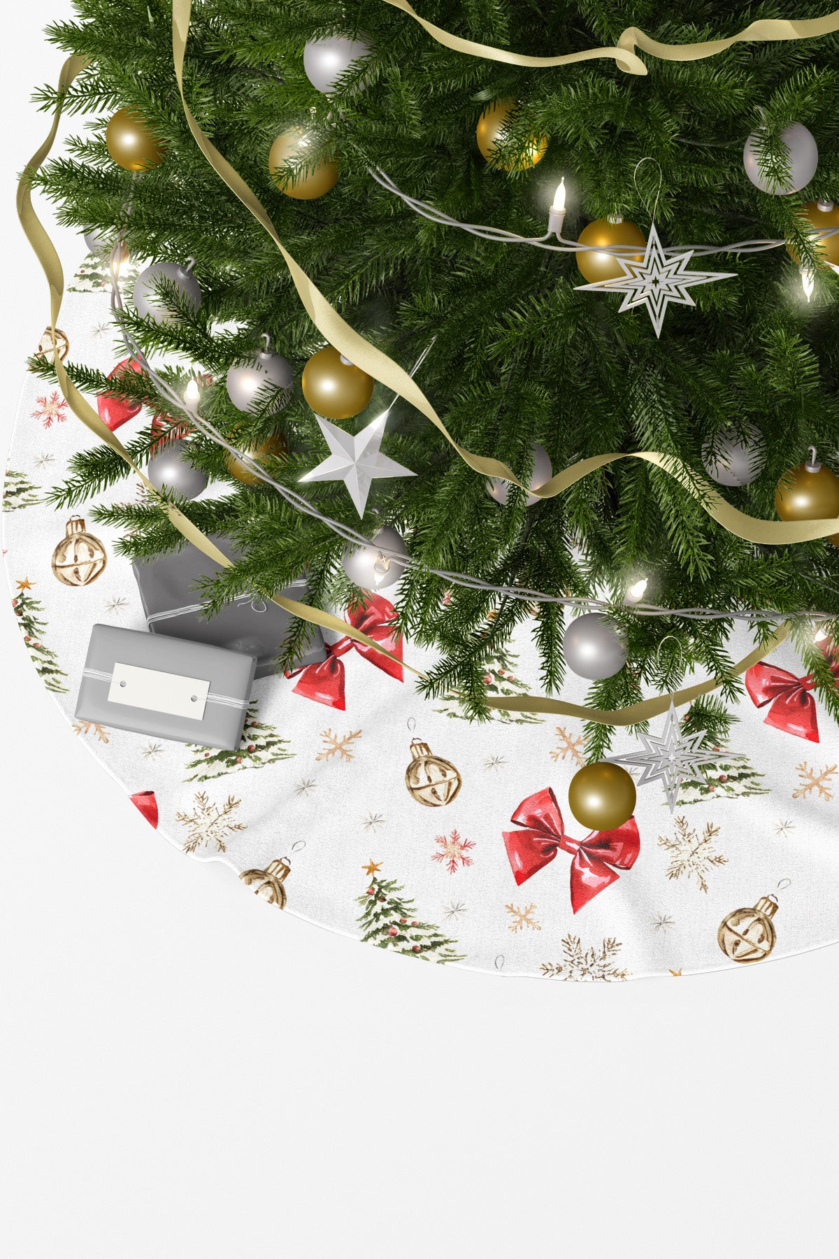 Yılbaşı ağacınızın altına masalsı bir dokunuş katacak olan bu ağaç altı eteği, beyaz zemin üzerinde sulu boya tekniğiyle hazırlanmış zarif bir desen sunar. Desen; çam ağaçları, altın ve gümüş tonlarında yılbaşı süsleri, büyük kırmızı fiyonklar, kar taneleri ve yıldız figürlerinden oluşur. Bu canlı ve detaylı tasarım, ağacınızın altını adeta bir hediye sahnesine çevirirken, aynı zamanda yılbaşı hediye kutularınız için de şık ve mevsimlik bir fon oluşturur.