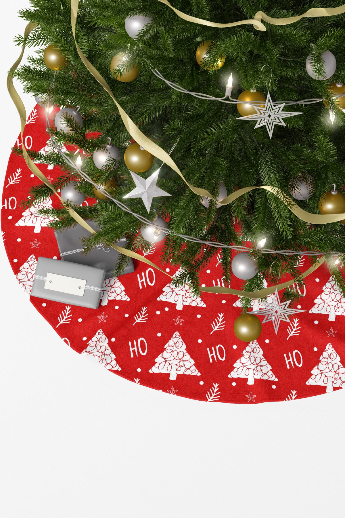Yılbaşı ağacınızın altına enerjik ve göz alıcı bir dokunuş katacak bu ağaç altı eteği, canlı kırmızı zemin üzerine beyaz renkteki şenlikli motiflerle süslenmiştir. Desende, stilize edilmiş süslü çam ağacı figürleri, küçük kar taneleri, yıldızlar ve Noel Baba'nın neşesini yansıtan "HO" yazıları yer alır. Kırmızı ve beyazın çarpıcı uyumu, ağacınızın altını adeta bir kutlama sahnesine dönüştürerek hediye sunumunuz için mükemmel, neşeli ve dikkat çekici bir zemin oluşturur.
