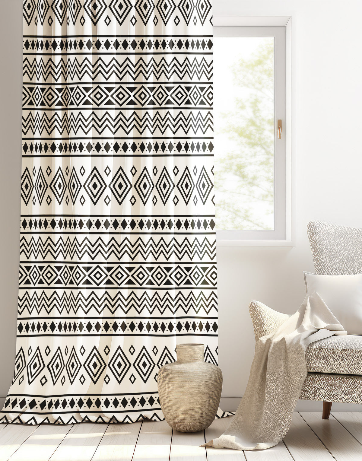 Mekânınıza modern, etnik ve sofistike bir hava katacak bu geometrik fon perde, siyah-beyaz kontrastının gücünü sergiliyor. Canlı ve keskin hatlara sahip zigzaglar, elmas şekilleri ve geleneksel motiflerin bir araya gelerek oluşturduğu bu göz alıcı desen, Boho (Bohem) veya İskandinav tarzı dekorasyonlarla mükemmel bir uyum yakalar. Yüksek kaliteli, dökümlü kumaşı üzerinde kusursuz bir baskı kalitesine sahip olan bu perde, pencerenizi sade bir geçişten çıkarıp, odanın dinamik ve stil sahibi odak noktası haline getirir; modern, minimalist veya eklektik her türlü yaşam alanına güçlü bir karakter katar.