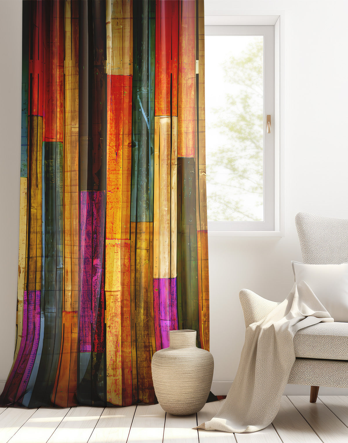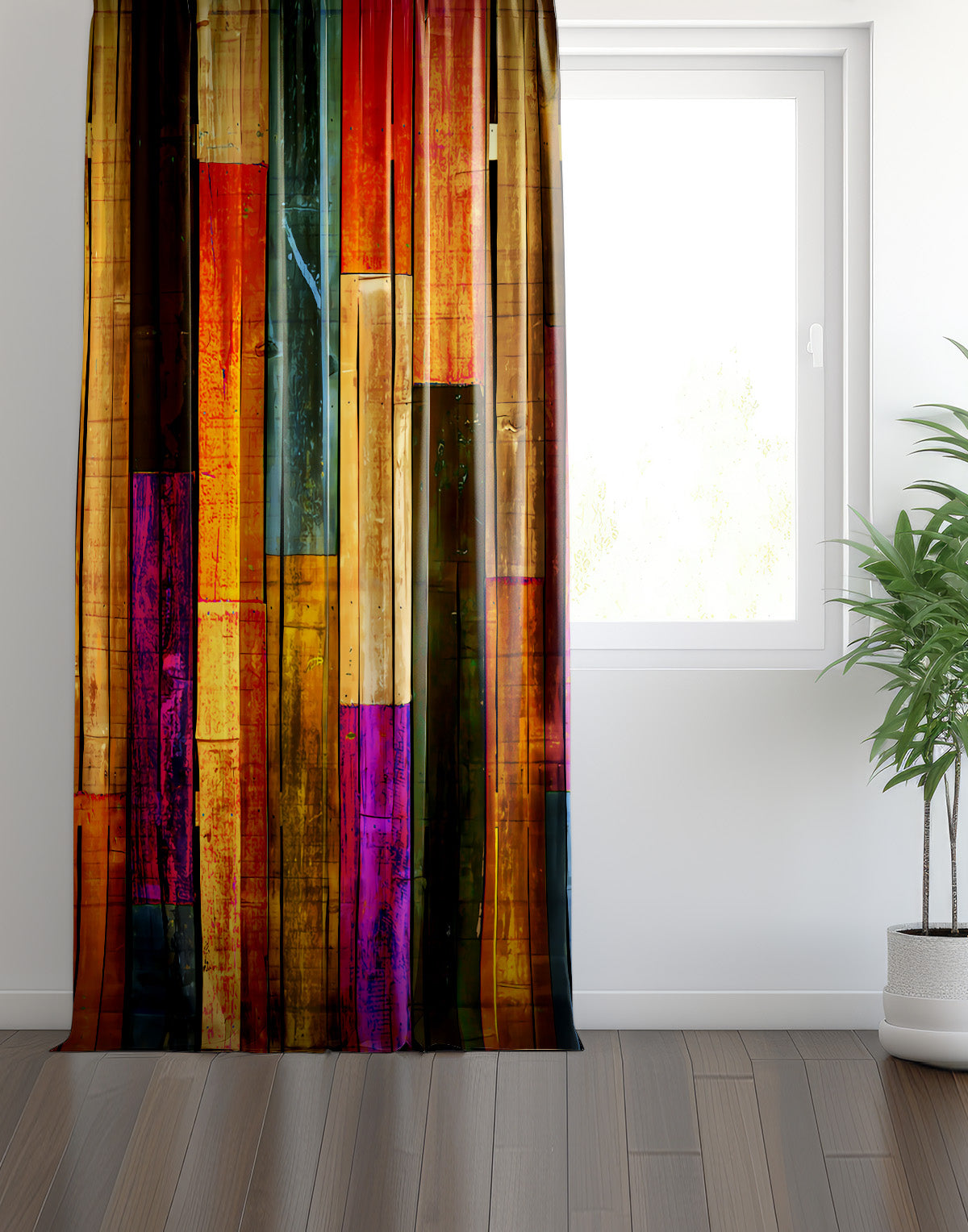 Evinizin enerjisini ve karakterini anında yükseltecek bu çarpıcı fon perde, rustik ve bohem tarzı bir araya getiren canlı bir tasarıma sahiptir. Eskitilmiş ve dikey konumlandırılmış, rengarenk ahşap palet dokusunu yansıtan dijital baskısı ile pencerenize sanatsal bir derinlik katarken, kırmızılar, turuncular, sarılar ve morların dinamik uyumu sayesinde yaşam alanınıza sıcak, davetkar ve eşsiz bir atmosfer sunar. Yüksek kaliteli kumaşı ve yüksek çözünürlüklü baskısıyla uzun ömürlü bir şıklık sunan bu perde, özellikle beyaz ve sade mobilyalarla kontrast oluşturarak tüm dikkatleri üzerine çekecektir.