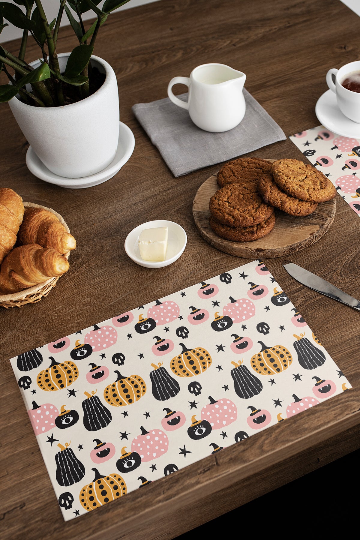 Krem rengi zemin üzerine modern ve sevimli Cadılar Bayramı temalı desenlerle bezeli bu Amerikan Servisi, masanıza neşeli ve şık bir atmosfer katacak. Siyah, hardal sarısı ve soluk pembe tonlarındaki stilize balkabağı figürleri, küçük kafatasları ve yıldız motifleri ile alternatif bir estetik sunar. Puantiye ve çizgili dokularla zenginleştirilmiş balkabağı desenleri, vampir dişleri ve cadı şapkaları gibi eğlenceli detaylar içerir. Geleneksel korku temasından uzak, daha sevimli ve modern bir sonbahar veya Cadılar Bayramı dekorasyonu arayanlar için ideal bir üründür.