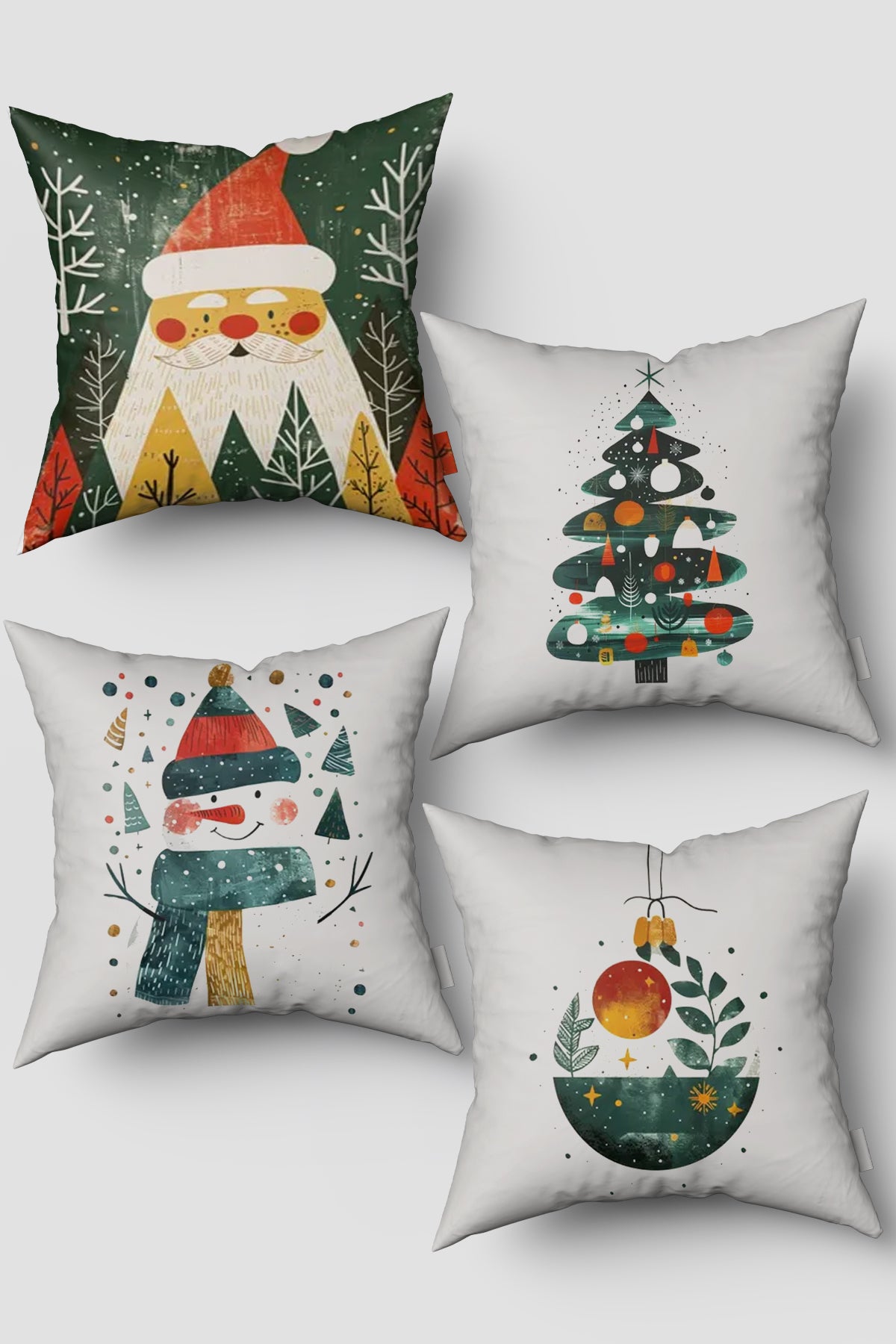 - Noel Temalı Yeşil Çam Ağacı ve Kardan Adam Yılbaşı 4'lü Kırlent Kılıfı Seti